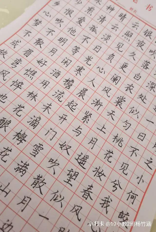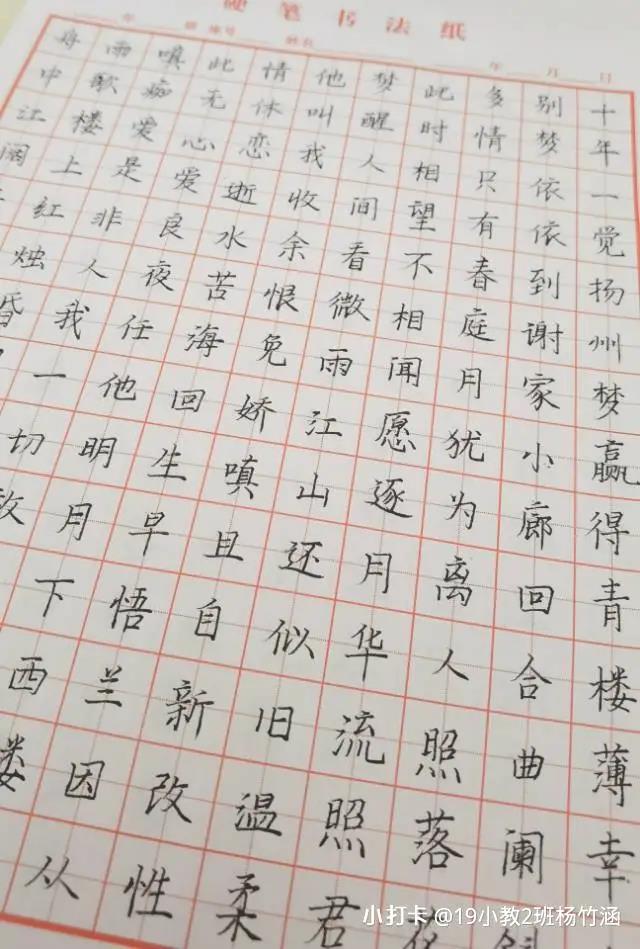 19小教2班的杨竹涵选择的是专术业类的硬笔书法。这21天的硬笔书法练习令她实实在在地感受到了自己在字体的结构以及起笔等方面的显著进步。在练习时,她会选择一些古诗词来作为练习的素材,这在无形之中也帮助她复习与积累了更多的古诗词。