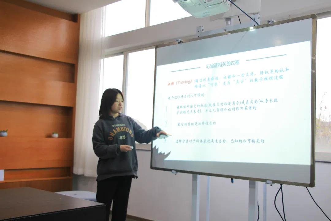 19小教3班刘书妤向大家介绍了《学校数学推理的概念模型》。这篇论文主要关注数学推理这个抽象概念的问题,并简单介绍了其含义及核心方面的内容,从结构与过程两个中心方面深刻剖析了数学推理。刘书妤认为,数学推理这种模式可以帮助教育者更好地进行交流教学,更多地开发所需的学习资源,为我们的学校教学活动服务。