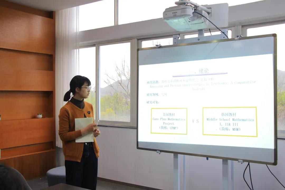 19小教4班徐雯漪带来的是《教科书中的推理和证明机会:比较分析》,这篇文献主要将美国教材与韩国教材在几何领域进行了对比,将教材中推理与证明的研究划分为数学陈述部分及练习部分,并通过对多种题型的研究来总结经验。徐雯漪利用表格直接呈现了不同类别间的差异,并表达了自己的心得:不同的教材都有着不同却又鲜明的特色,教师在课堂上的授课方式比教材更为重要。