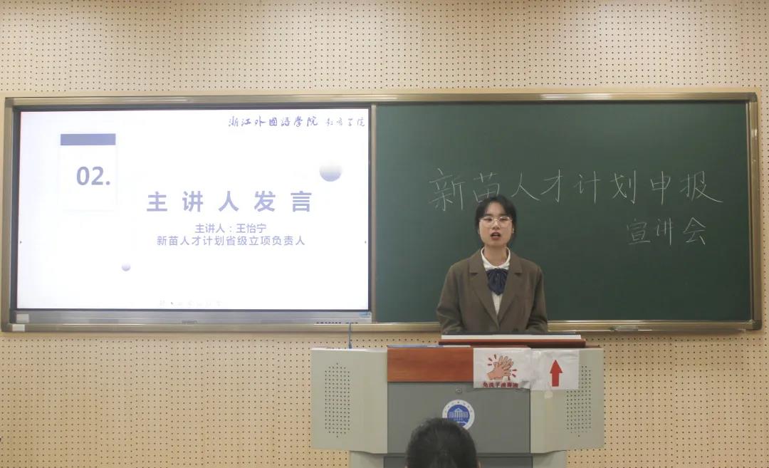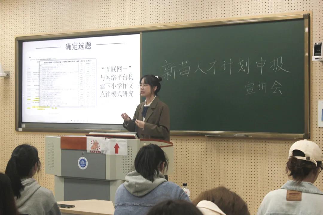 为提升学院学生创新创业能力与素养,鼓励学生积极申报新苗人才计划,4月1日,学院创新创业实践中心于望D120举办了新苗人才计划申报分享会。本次分享会邀请到了我院2020年浙江省新苗人才计划省级立项项目负责人——18小教2班的王怡宁分享经验。
