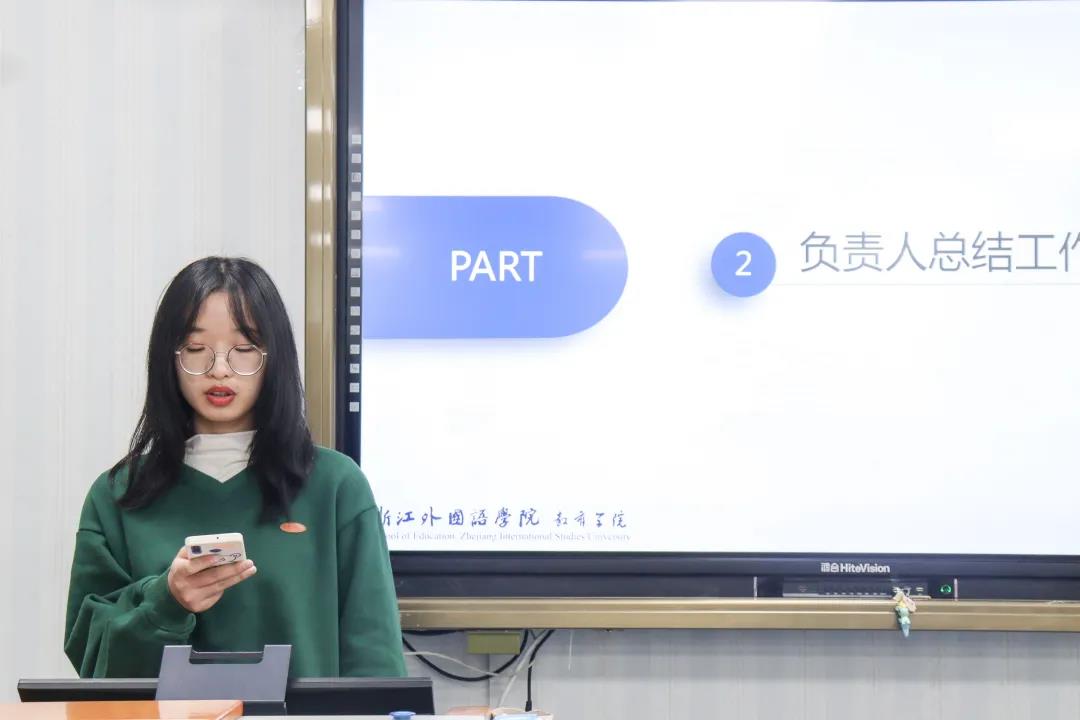 唐人街影院负责人陈心怡作上学期唐人街影院工作总结,用“潜力”“推陈出新”“人物专访”等关键词来对上一学期工作进行总结提炼。她认为新闻工作于她就是一个赋能的过程——双向的过程,并鼓励唐人街影院在接下来的部门工作中朝着打造品牌特色的方向努力。同时也介绍了本学期的工作重点及安排。