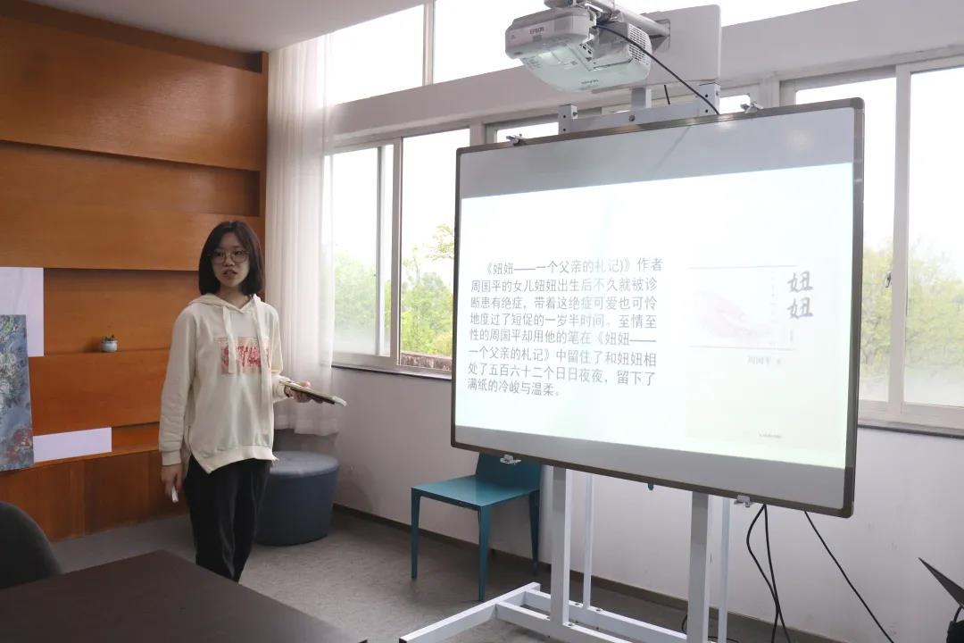 吴卫东对四位同学的分享逐一进行点评,认为他们富有真情实感的读书分享打动人心,也使自己收获良多。她鼓励同学们在最适合读书的年纪主动挖掘感兴趣的作者和书籍,并提出了教学方面的两点建议:第一,在表达过程中讲述者的语速应照顾听众体验;第二,PPT制作应进一步追求美观。