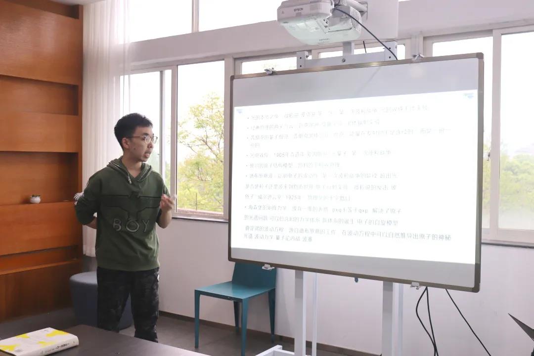 18小教3班吴易阳介绍了曹天元的量子物理史话《上帝掷骰子了吗》。本书围绕光的本质之争,从三次波粒战争开始,到爱因斯坦与波尔的世纪之争结束,展现了量子力学体系纷争不断的发展史。同时,作为一本科普类书籍,本书以激昂的语言塑造了一批生动鲜活的物理学家形象,普及了许多有趣的逸闻。吴易阳激情朗诵了书中的片段,认为读这本书的意义不仅在于了解丰富的物理学知识,更在于领略物理魅力和物理学家可贵的科学精神。