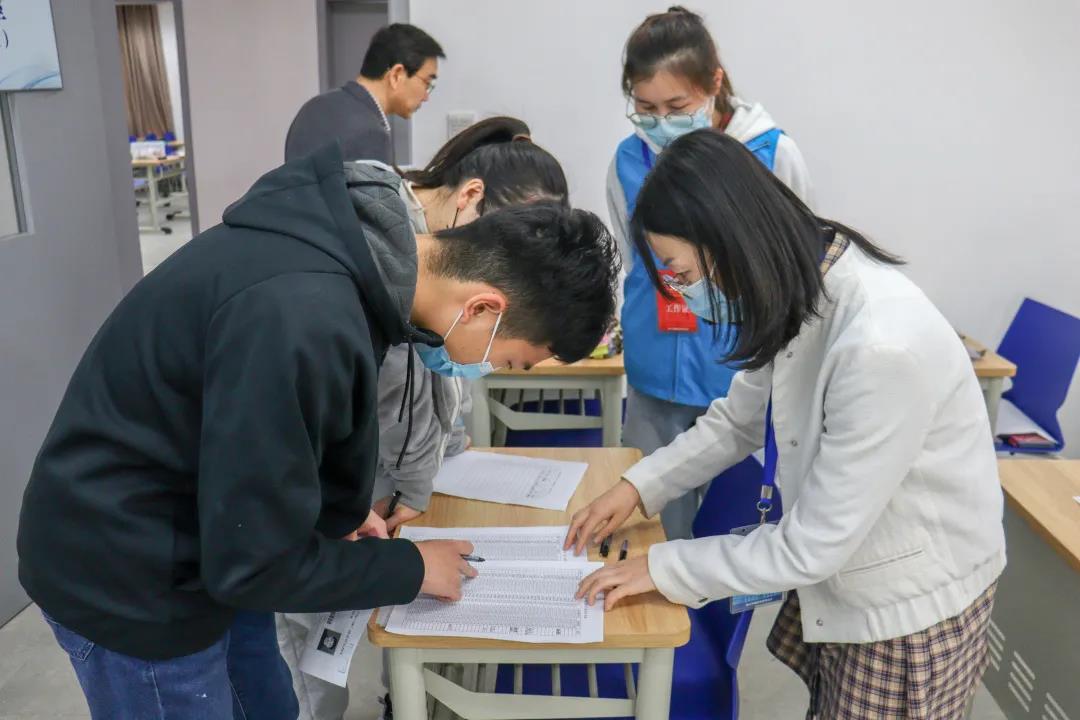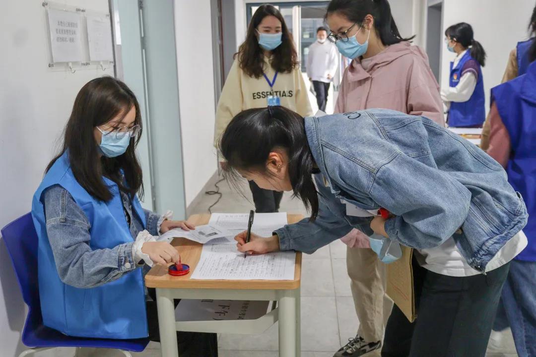 育育:几分好奇、几分不安,绕过行健馆,考生们在进入融院前排起了长龙。在志愿者们的协助下,他们签到、抽取考试组别、存放随身物品,携带着证件奔赴考场。
