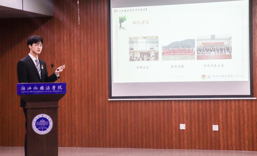 在现场展示汇报环节,院学生会执行主席胡啟楠作为主讲人,从学院教育专业背景出发,通过诠释“一棵树摇动另一棵树,一个灵魂唤醒另一个灵魂”的名言来引入主题一一“一棵树的灵魂”,以“植根”、“生长”、“向阳”为喻,展现了我院学生会贯彻落实改革、坚持服务初心以及追求进取卓越的优良风范。