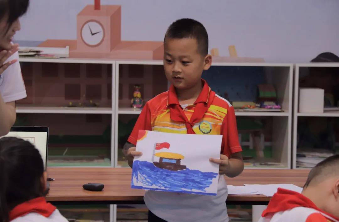 “100年前,党的梦想在南湖红船上启航……”队员们绘声绘色地讲述着,小营员们背挺得笔直,闪亮的眼睛盯着老师,听得格外认真。为了让他们更直观地感受红色精神,队员带领着他们画下了心中的“红船”。在红领巾学堂的第一节中,队员们将党史学习教育融入课堂,开展别具一格的红色故事分享会,讲述了冰雕连战士坚定的信念和宁死不屈的如磐意志。“老师,如果是我,我也会坚持到底,直到牺牲也要跟敌人奋战!”孩子们纷纷表示,要更加热爱祖国,勤奋学习,将来成为一个有知识、有文化、合格的社会主义事业建设者和接班人!