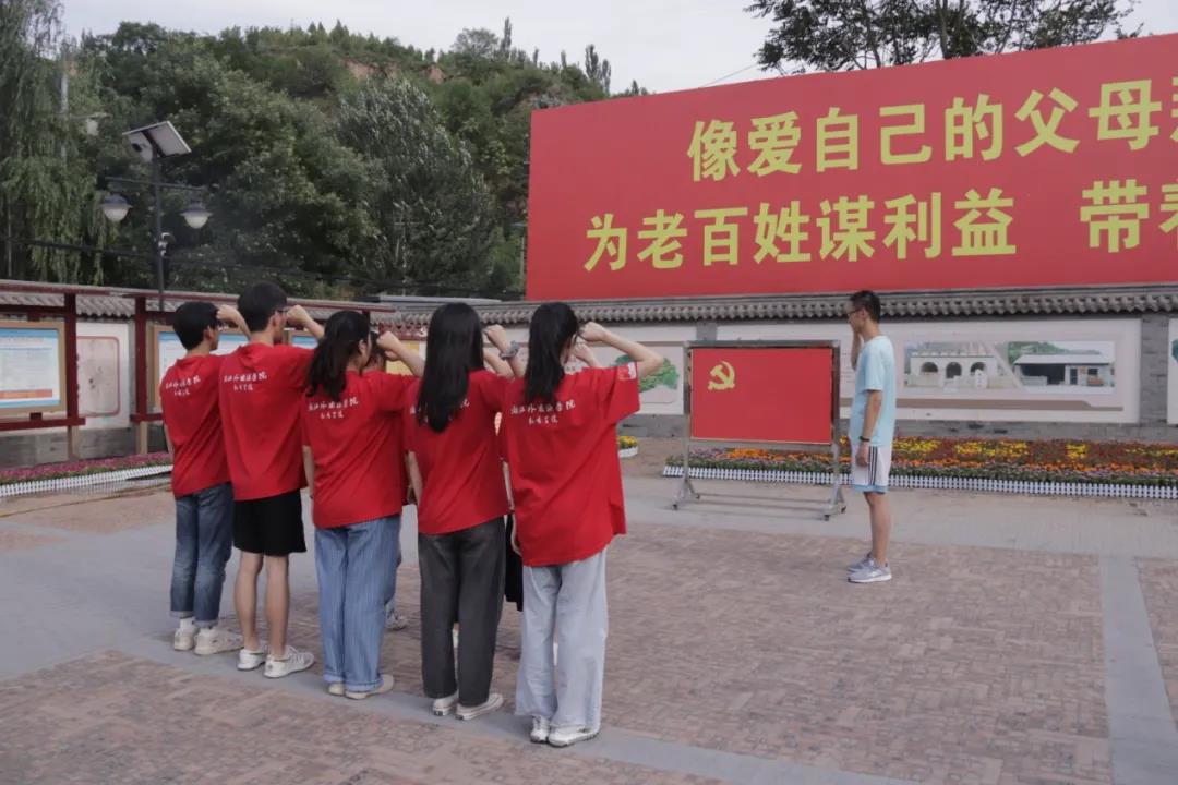 在梁家河村史馆前,面对神圣的党旗,实践队员们在高原老师的带领下,举起右拳,掷地有声地重温了入党誓词。