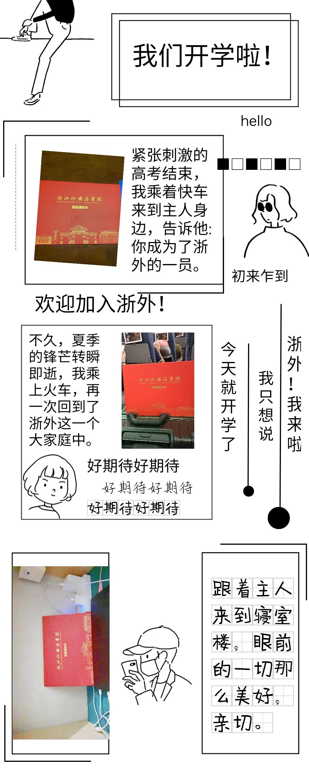 在浙外“神兽归笼”的召唤下,我将期待与胆怯,欣喜与不安背上行囊,再次踏上新的旅程,如期赶赴这场青春的约会。“进入浙外门,就是浙家人”。