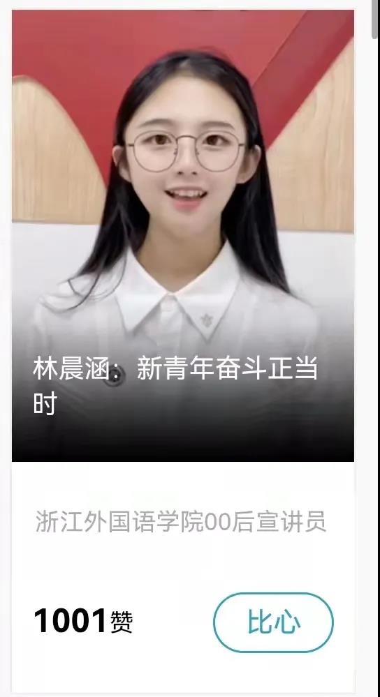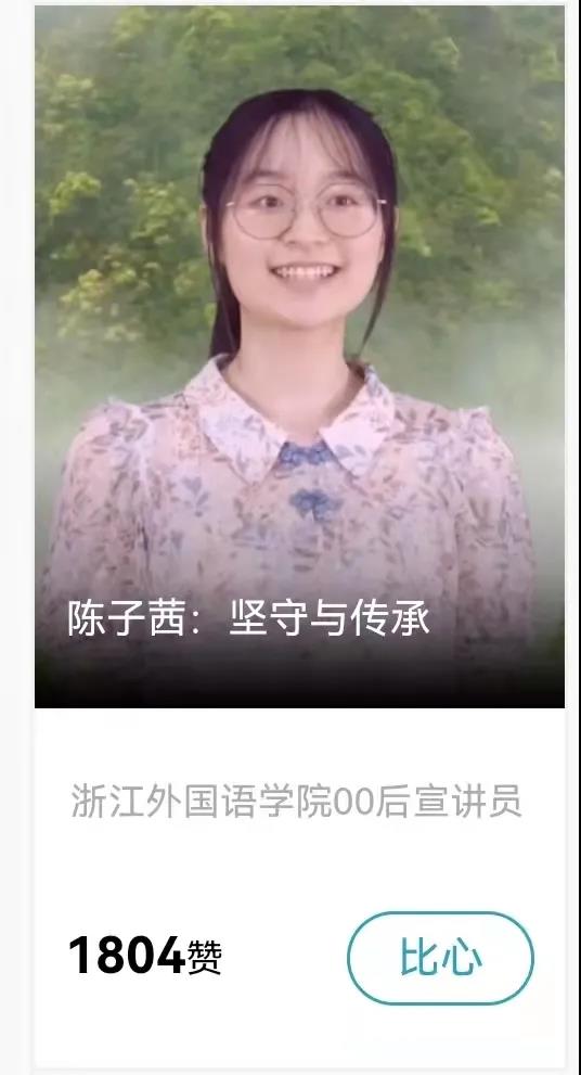 我院学生郎语璐,参与拍摄杭州市志愿者服务礼仪视频教程,担任2020年世界互联网大会外宾联络组志愿者,参加杭州第19届亚运会开幕式倒计时两周年活动朗诵方阵,入围杭州亚运会赛事服务礼仪序列组,学校多语种宣讲团成员。她呼吁我们青年需要把自己的小我融入祖国的大我,与时代同步伐、与世界共命运。