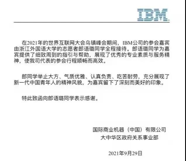 2019级小学教育专业郎语璐同学收到了IBM大中华区政府关系事业部的感谢信。信中提到,郎语璐同学为嘉宾提供了细致周到的指引与帮助,展现了优秀的专业素养、服务精神,以及新一代中国青年人的精神风貌。