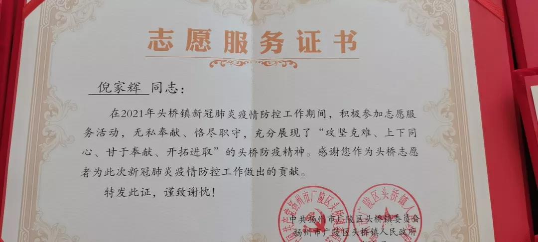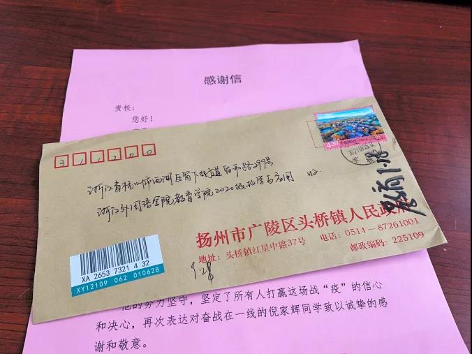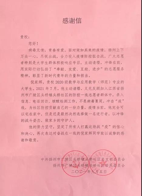 收到一封温暖的信——来自中共扬州市广陵区头桥镇头桥社区总支部委员会、头桥镇头桥社区居民委员会的感谢信。信中真切表达了对投身疫情防控一线的青年志愿者倪家辉同学的感谢,赞扬他用实际行动弘扬志愿精神,彰显新时代青年的力量与担当。