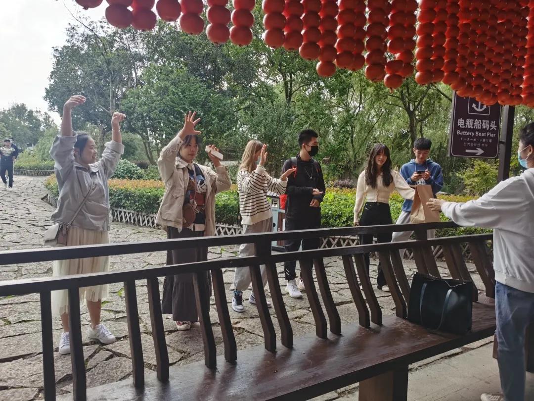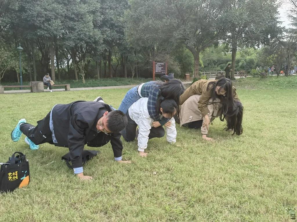 首先是“动作应答”环节。所有成员被随机分配为九个小组。小组成员们需要统一做出对应词语的标志性动作,成功五个之后方可通关。通过对经典人物和经典电影标志性动作的演绎,各团小组成员初次组队时的拘束紧张的局面逐渐在秋日的暖阳中消融,美好的故事已经在秀丽的西溪湿地里展开。
