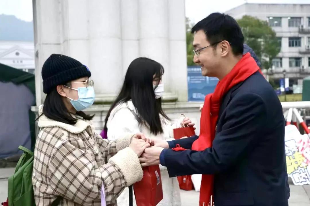 当2021年的日历撕到最后一个月份,考研倒计时最后1天。为了表达对考研学生的关心与慰问,传递寒冬中的温暖和力量,12月24日下午,学院组织“爱心专车”送考生前往考场,护送考生到考场“最后一公里”。学院领导班子、毕业班班主任辅导员、学院吉祥物育育来到现场送学生上车,赠予考研学子承载着教院人温暖、鼓励和爱的专属助力礼包。学弟学妹们也手持祝福KT板,来为学长学姐加油打气。