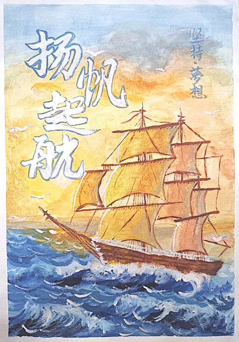 帆船在大海中乘风破浪、扬帆起航寓意充满理想的我们在社会环境中坚定理想,勇往直前。而阳光象征着希望和光明的前途,海鸥便是我们成功路上的陪伴者和见证者。希望所有为梦想奋斗的人都能到达胜利的彼岸!
