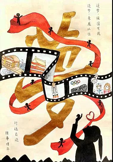 “立志和山”激扬起新时代青年的强大思想共鸣,“笃行万里”鼓舞着新时代青年为建设祖国的大好河山贡献力量。海报主体以中国地图为背景,暗示着祖国的疆域辽阔和国土的不可分割,万里长城则象征着中华民族走向现代的艰难险阻。在海报制作过程中,结合了中华传统的水墨以及现代艺术拼贴,寄托了对祖国从文明古国到现代强国的热爱。