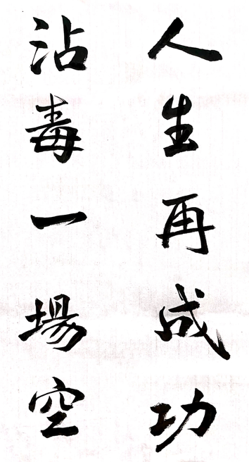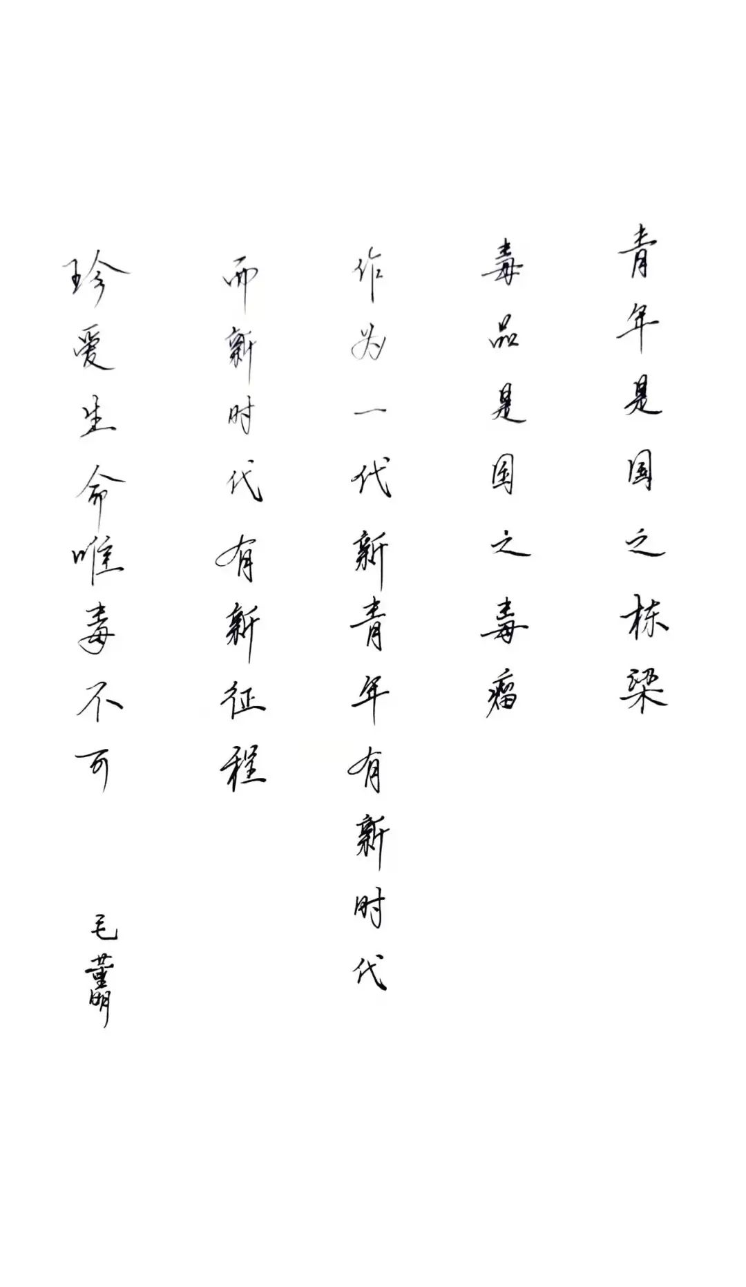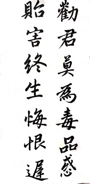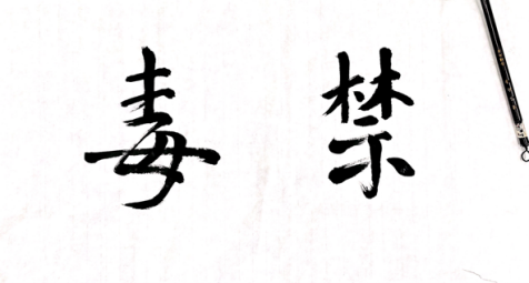 20小教1班、20数学1班、21科教1班以苍劲有力的书法作品诠释着劝诫人们远离毒品的决心。黑白配色简单却不失冲击力,书法内容简短却内涵深刻,警示青年切忌因毒品断送美好前程。