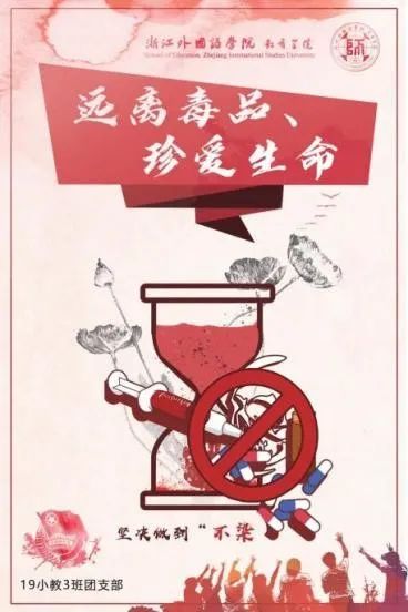 19小教3班团支部借助针筒、药物、白骨和血液沙漏等元素设计的海报,介绍了毒品的传播媒介和危害性,红色的禁止符号代表坚决抵制毒品的态度!以荷莲为背景,“出淤泥而不染”的高尚品德正呼应“不染”的标题,劝告大家远离毒品。