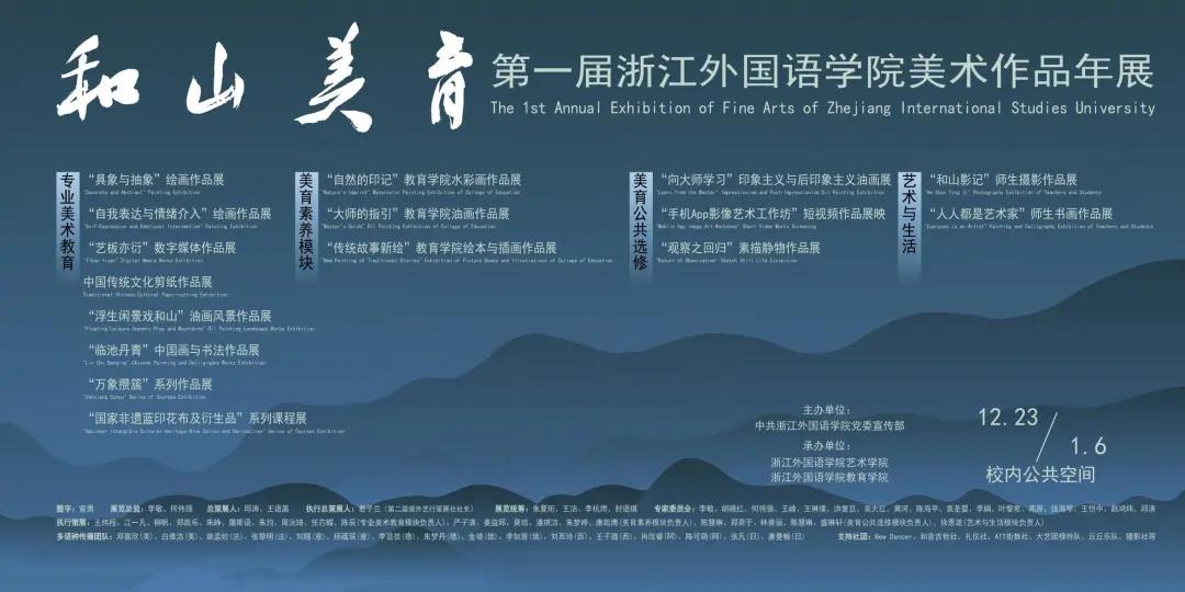 模块执行策展人:柳帆、郑凯乐、王炜程、江一凡、朱峥、屠斯语、朱均、徐亿璞、周沅琦、任芯蠼、陈辰(专业美术教育模块负责人)、严子清、姜益邱、莫琼、潘琪洁、朱梦婷、唐凯博(美育素养模块负责人)、陈慧琳、郑荷于、林雅丽、盛琳轩(美育公共选修模块负责人)、徐恩波、郑喆琪(艺术与生活模块负责人)