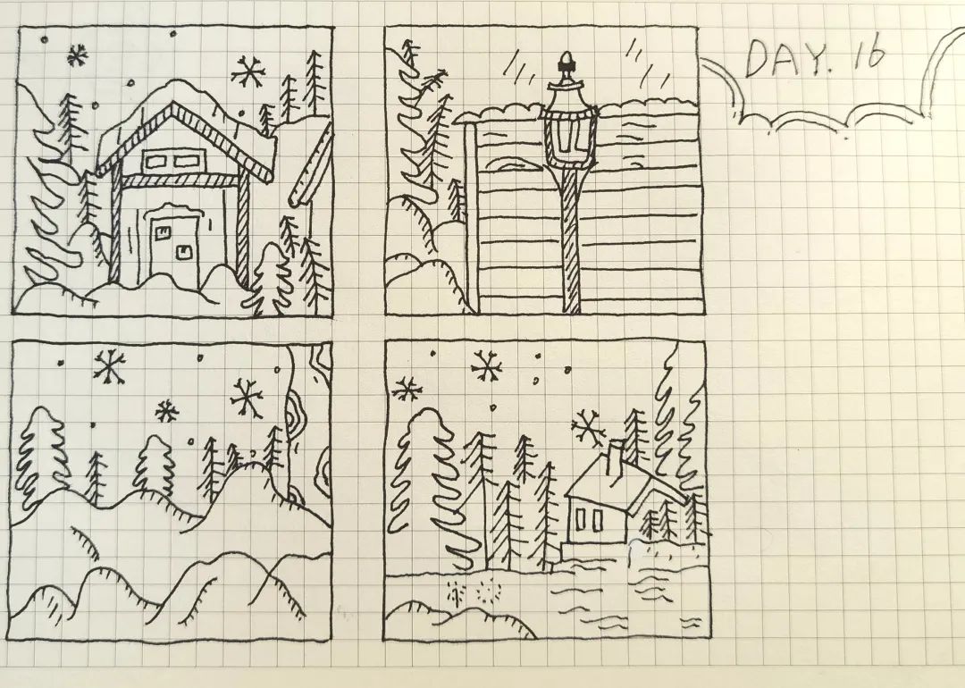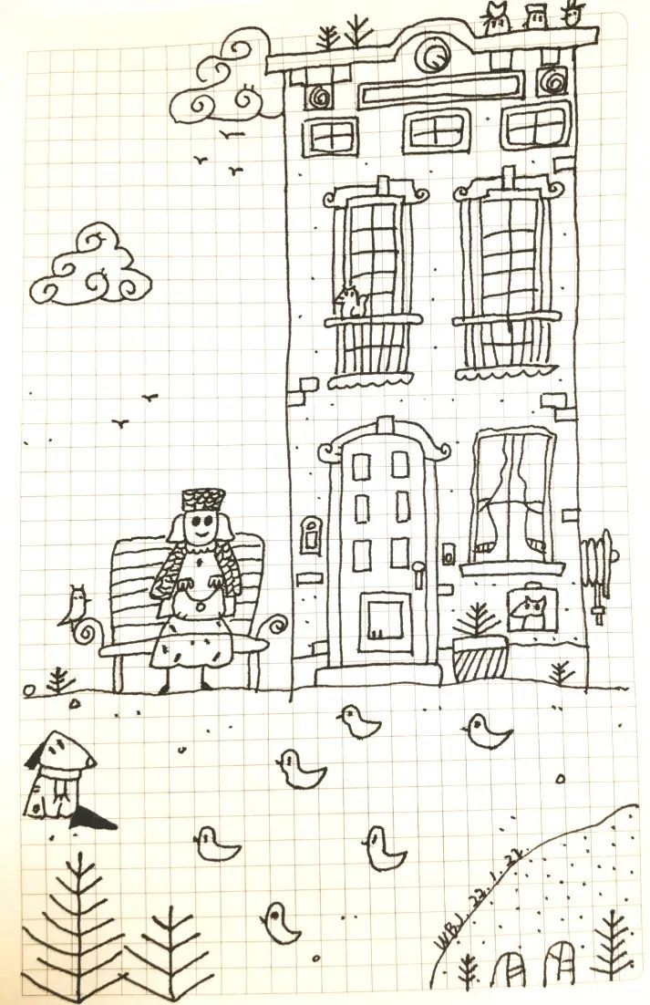 窗外淅淅沥沥的小雨,时而飘落几片雪花,坐在屋内听着自己喜欢的音乐,在白纸上画下一个个灵动的形象,偷得浮生半日闲。每天都能安安静静地做喜欢的事情,吴冰洁在积累绘画素材的同时,也打磨了自己的耐性。在轻松愉快的旋律中,21天不知不觉地就过去了。