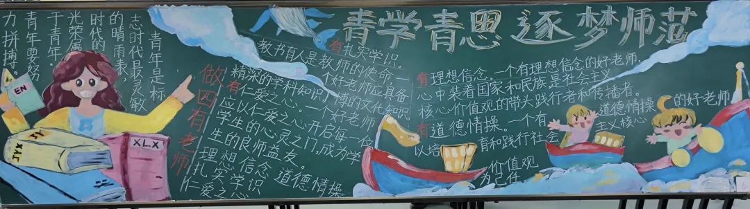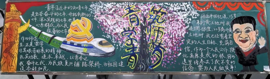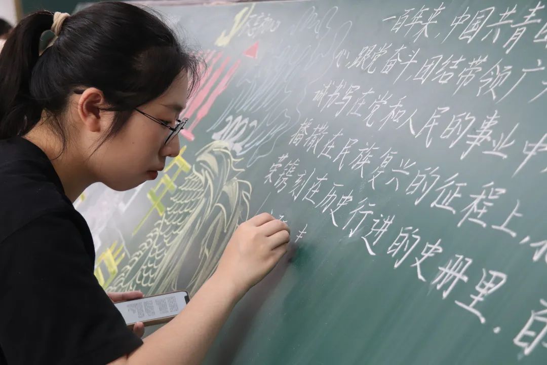 学生会于近日举行“青学青思正当时,卓越师范筑梦行”黑板报大赛。青年者,国家之魂。30组选手用各色颜料回望百年,用洁白粉笔书写团史,绘出属于师范生的生气、闯劲与青春力量。