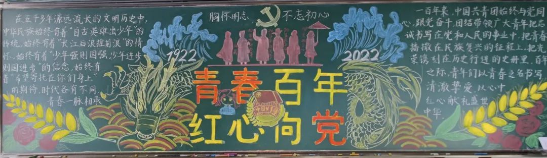理念介绍:青年是祖国的花朵,金黄的麦穗是工农阶级的象征,中国共青团永远紧紧依靠党的领导,带领广大青年学生团结、围绕在党的周围,因此在黑板的两侧是鲜花包围麦穗的设计。今年是中国共青团成立一百周年,百年征程,波澜壮阔。在黑板中间的青年剪影间,我们题写了张载的横渠四句,表达青年应胸怀明志,以天下为己任的抱负。板报正中间是巨龙腾飞在祥云上,盘踞在青年和党的周围,愿青年刚健有为,用智慧和汗水为祖国建设添砖加瓦!