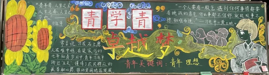 理念介绍:青学青思,卓越师范。将青年学子学青年习近平的感悟与师范特色相结合,是我们此次创作的主旨。在本次板报创作过程中,向上的黄色是青春积极的底色,沉静的蓝色是青春沉稳的铺垫,左半边向着朝阳的向日葵与右部分沉浸百年团史的先进青年遥相呼应,中间的“青学青,卓越梦”是我们青春的誓言。时代各有不同,青春一脉相承,作为师范生,我们要牢记习近平总书记的教诲与期望,一步一个脚印,用青年的力量传承百年荣光。