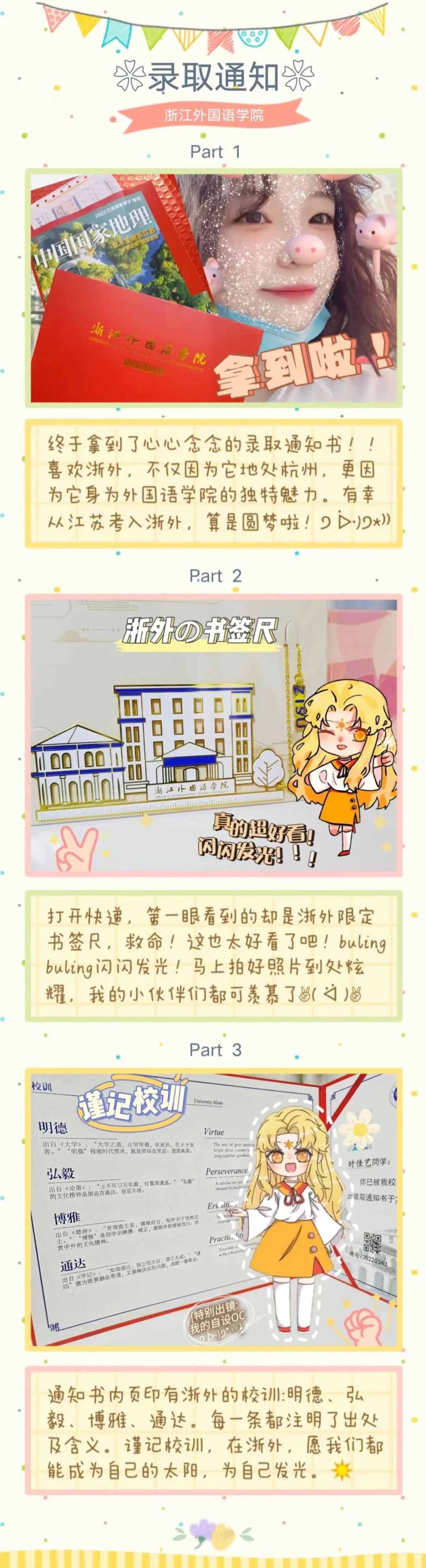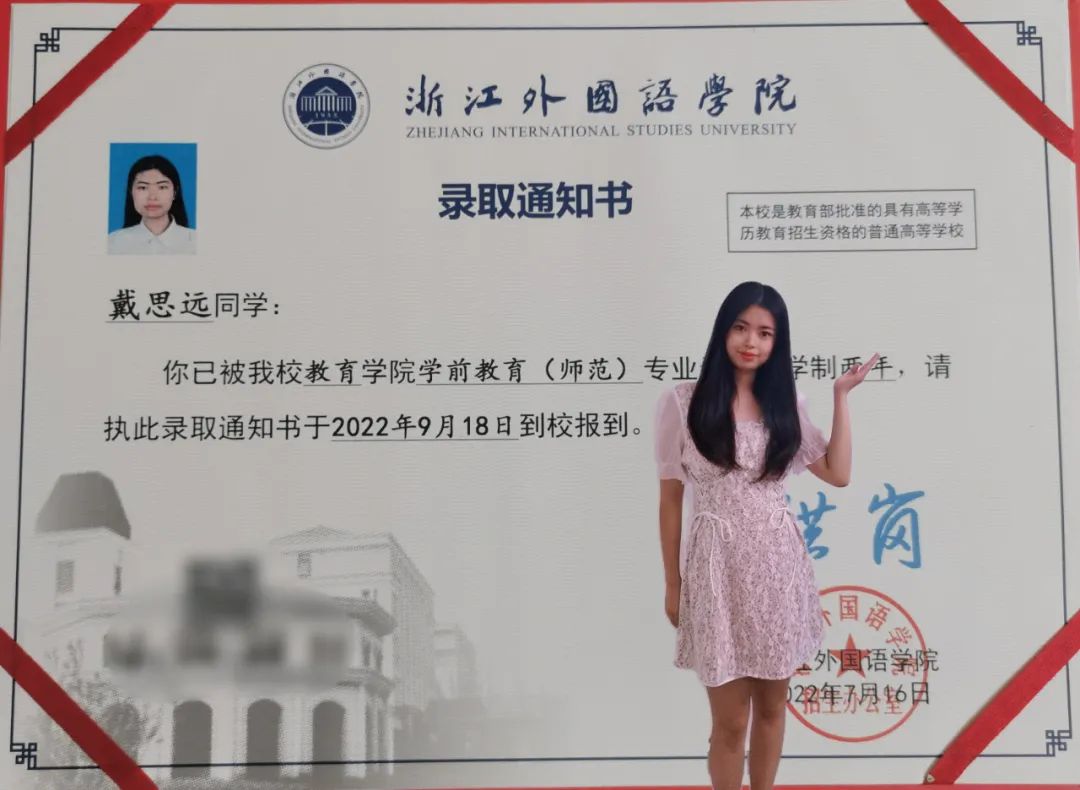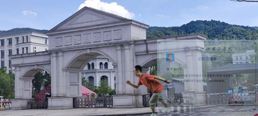 一拿到浙外录取通知书,我就欣喜不已。从高中毕业证书到大学录取通知书,是对以往高中幸苦的学习生活的肯定和褒奖,也是对未来大学生活的向往和憧憬,是从一个句号到新一个句号的开始。