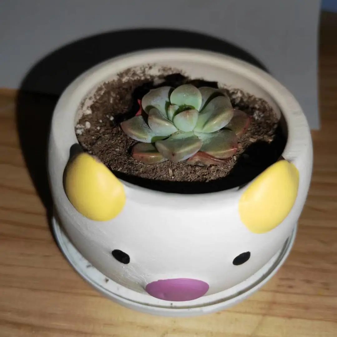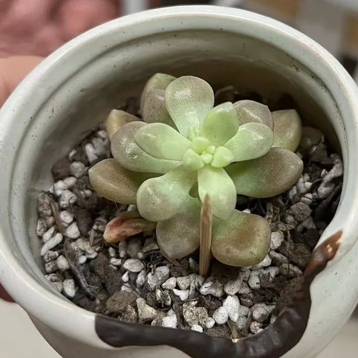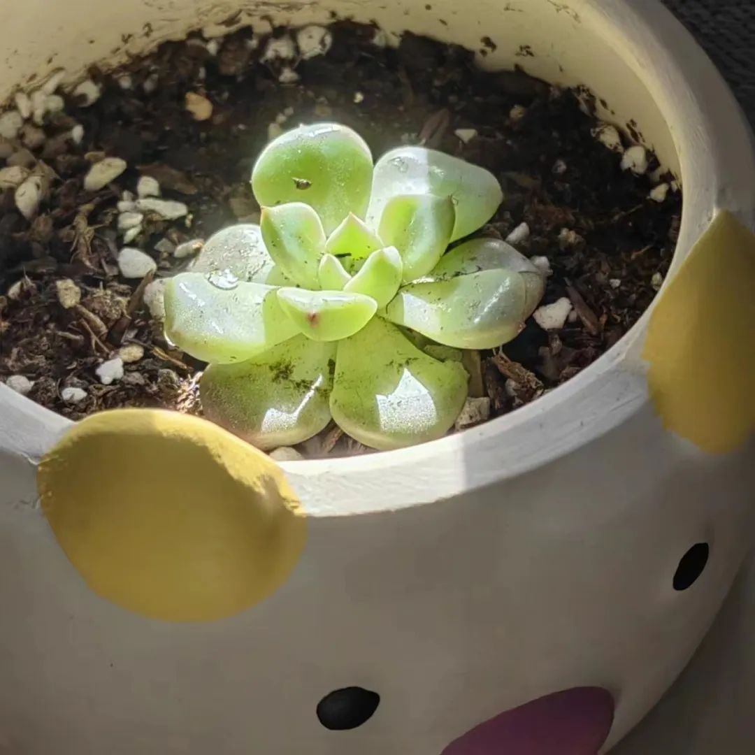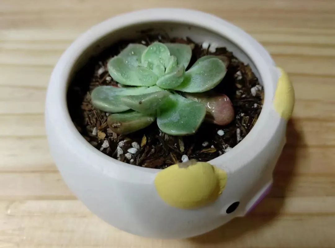 今天,我把领到的多肉种到泥土里,浇了些水。它的花瓣是绿色的,叶尖又是粉嫩粉嫩的,带些小细闪,肉嘟嘟的特别可爱。它的品种名叫“姬秋丽”,本来想叫它“小姬”的,但是它老是歪着长,最后就决定叫它“歪歪”啦。