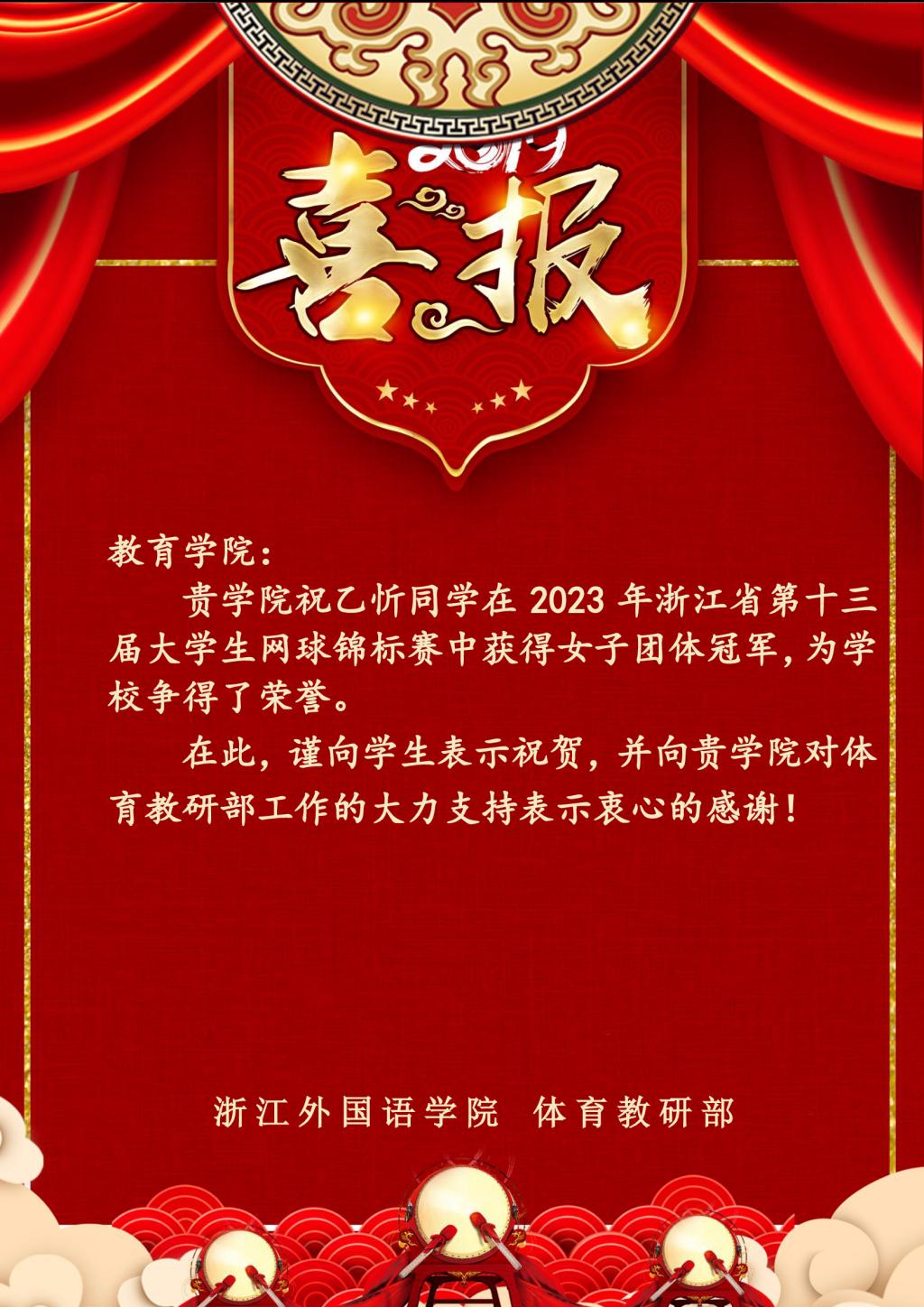 热烈祝贺祝乙忻同学在2023年浙江省第十三届大学生网球锦标赛中获得女子团体冠军!