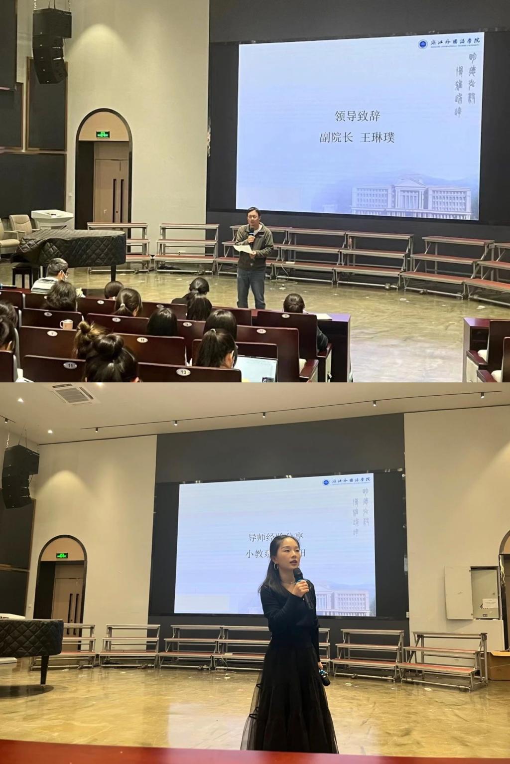 导师代表张帅认为大家需要在理论和实践的结合中感受其魅力,并真诚地建议脚踏实地地做好每一件事。老生代表,20学前1班班长王乐怡表达了对老师的感恩之情,她建议多与自己的导师进行交流。新生代表,23学前3班金冰姿希望大家应利用好学院提供的优秀导师资源,实现自我目标。23级辅导员俞贝老师希望同学们在大学生涯中不断探索,绽放自己的青春之花。