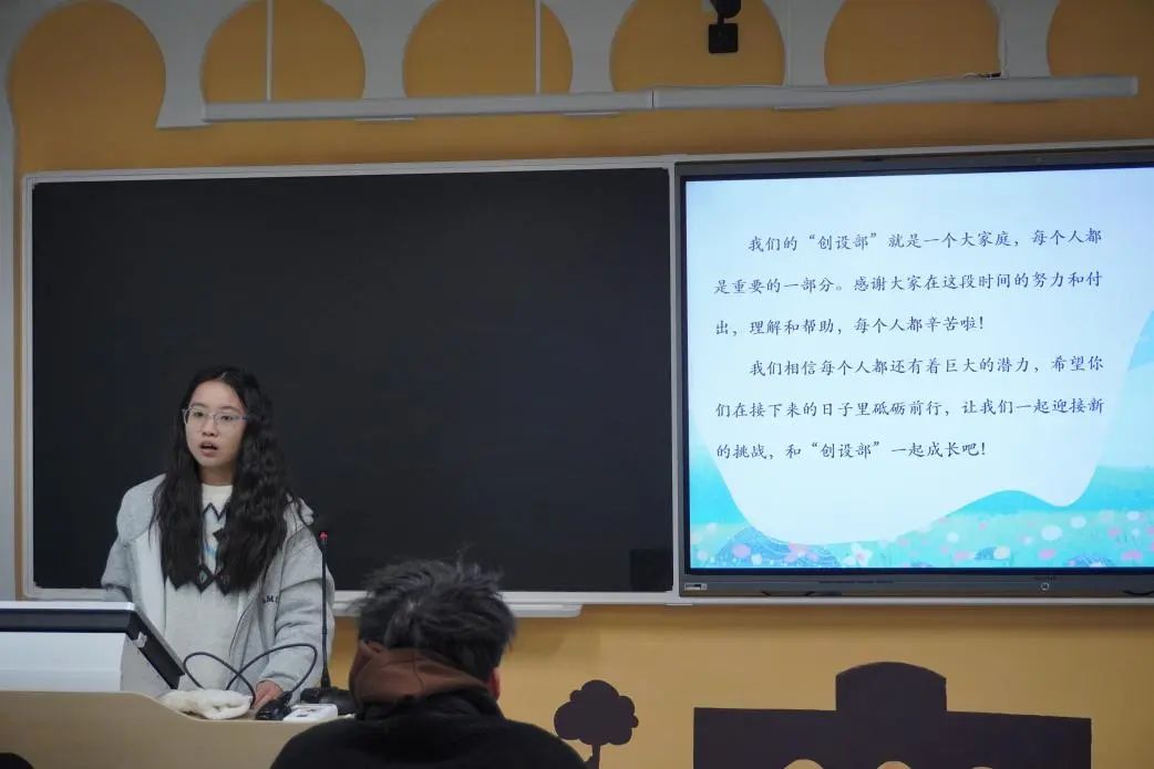 创设部负责人唐宁月通过工作回顾向大家展示了创设部本学期辛苦付出所获得的精彩成果,并分享了自己在部门工作时得到的成长与收获。她向干事们表达了诚挚的感谢与热诚的期待,希望大家能够一起迎接新的挑战,和创设部共同成长。