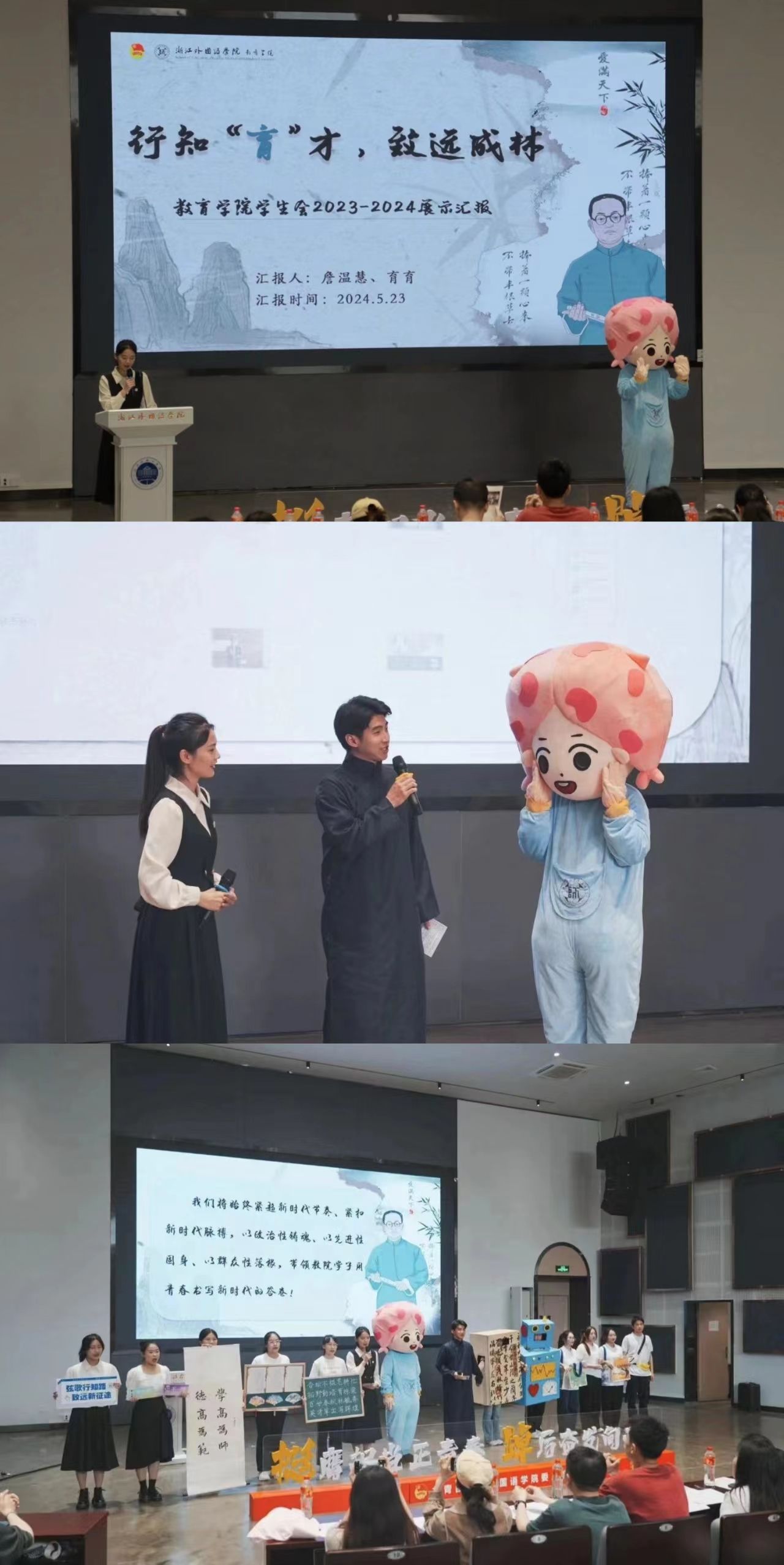 吉祥物育育作为主讲人,以学院的行知文化为脉络,从思想引领、权益维护、学风建设、志愿服务和文化建设等方面,始终坚持“全心全意为全体学生服务”的宗旨,通过“植根”、“生长”、“向阳”三个篇章,展示了这一学年的工作成果,充分展现了我院学生会贯彻落实改革、坚守服务初心以及追求卓越的优良风范。