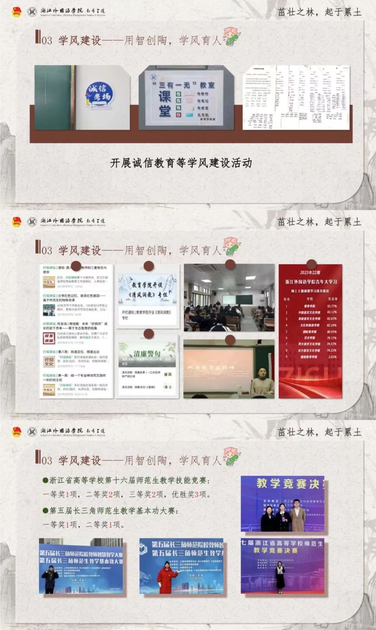 设立“三有一无”教室和诚信考场,并设行知讲坛、清风润教等专栏。同时,在各类创新创业赛事中获得多项国家级、省级荣誉。