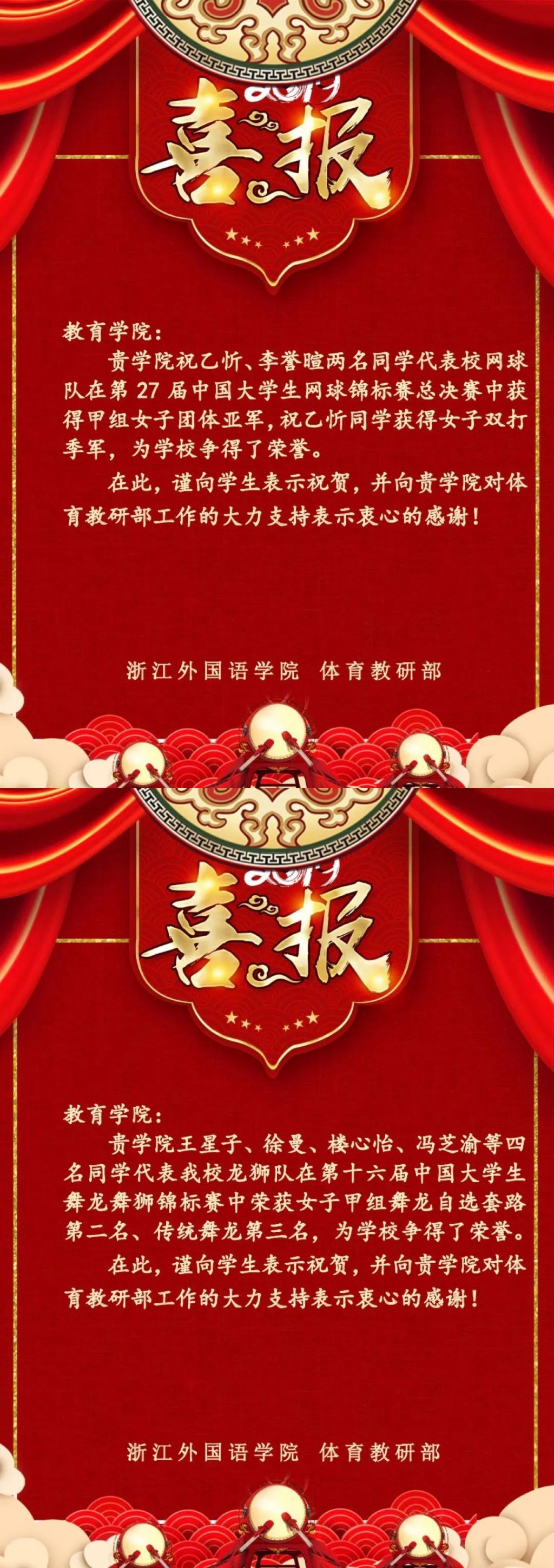 暑假期间,教院学子坚持训练,相互鼓励,共同进步,在第27届中国大学生网球锦标赛和第16届中国大学生舞龙舞狮锦标赛中取得佳绩!此向他们致以最热烈的祝贺!