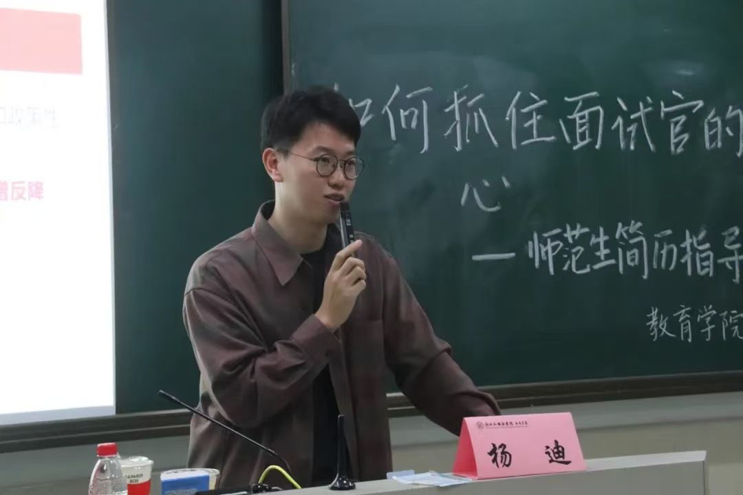 为帮毕业生们更好地理解简历的重要性,杨迪老师把简历比作了面试前的一场笔试。杨迪老师以这几年“师范生技能大赛”较前几年更受教育局的青睐为例,指出会读题目并且善于抓住踩分点是至关重要的。