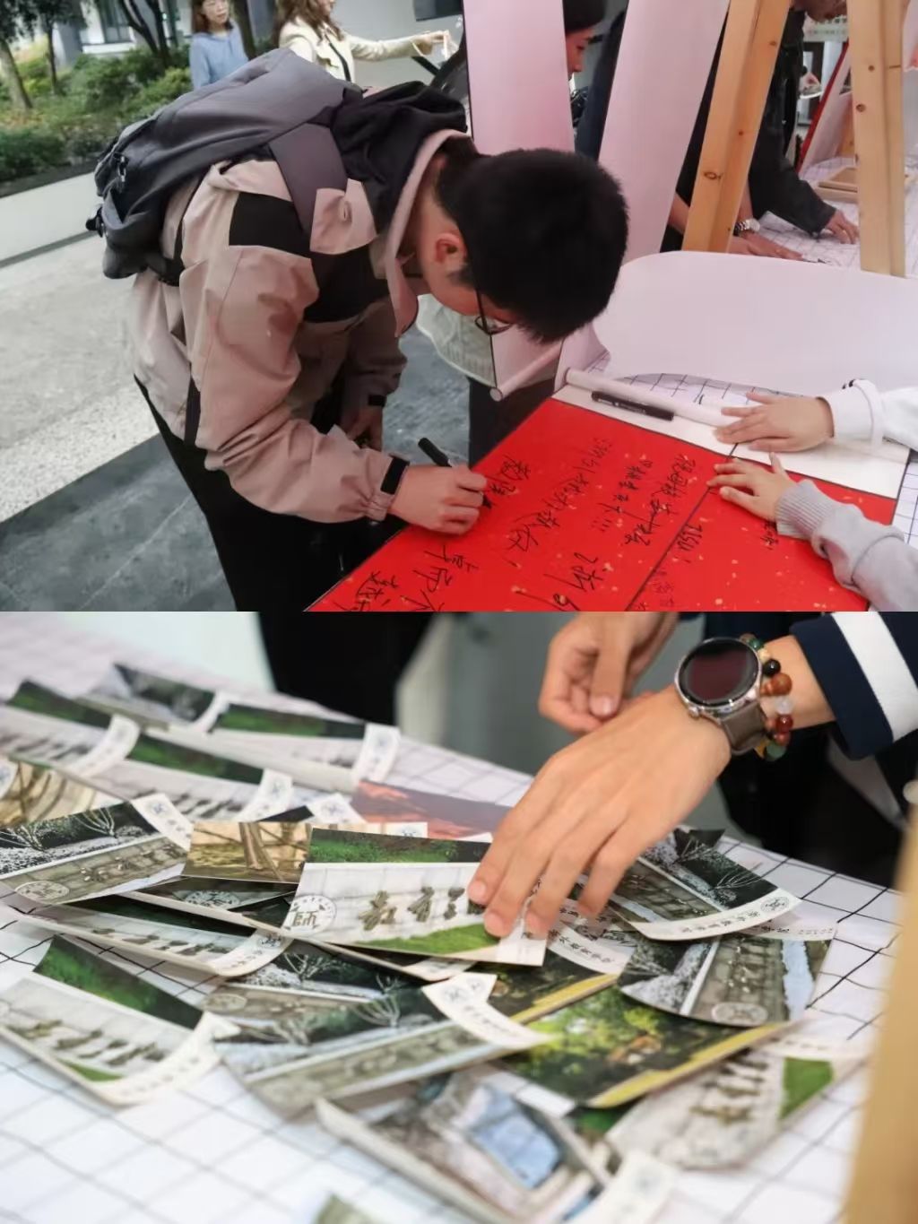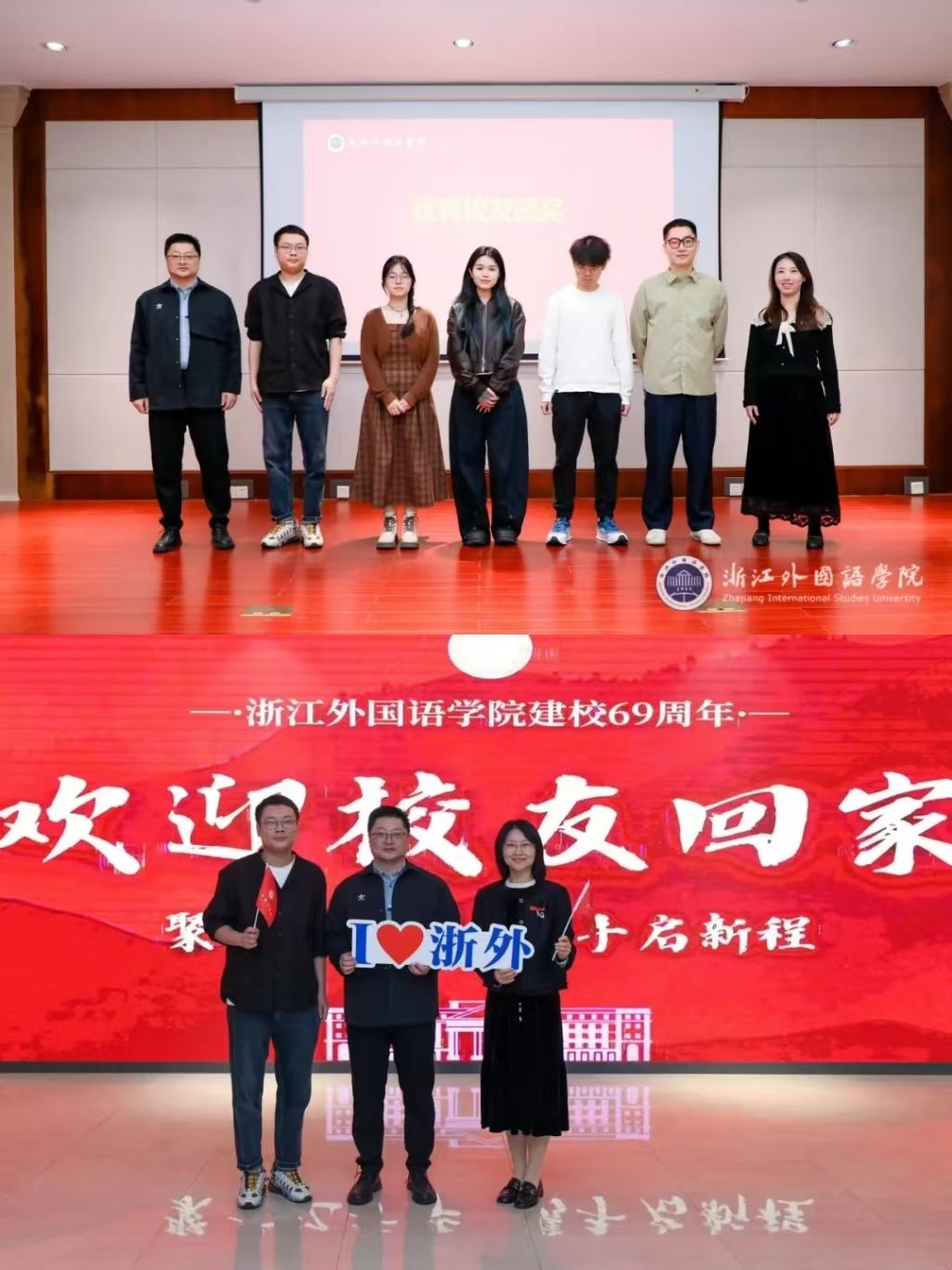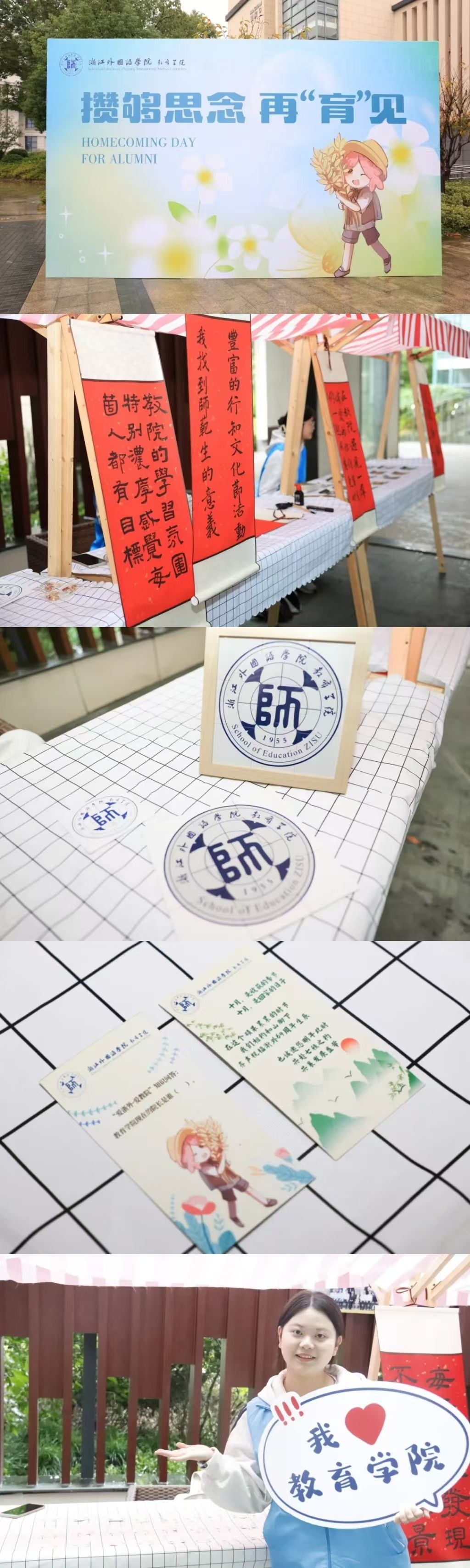 “I LOVE ZISU”、“祝浙外桃李满天下”,在行知像前,校友们拿着教院明信片,一边写下对教院的寄语,许下明年70周年校庆的殷切祝福,一边与老同学相互问候、合影留念,现场充满了欢声笑语,洋溢着浓浓的返校情怀。