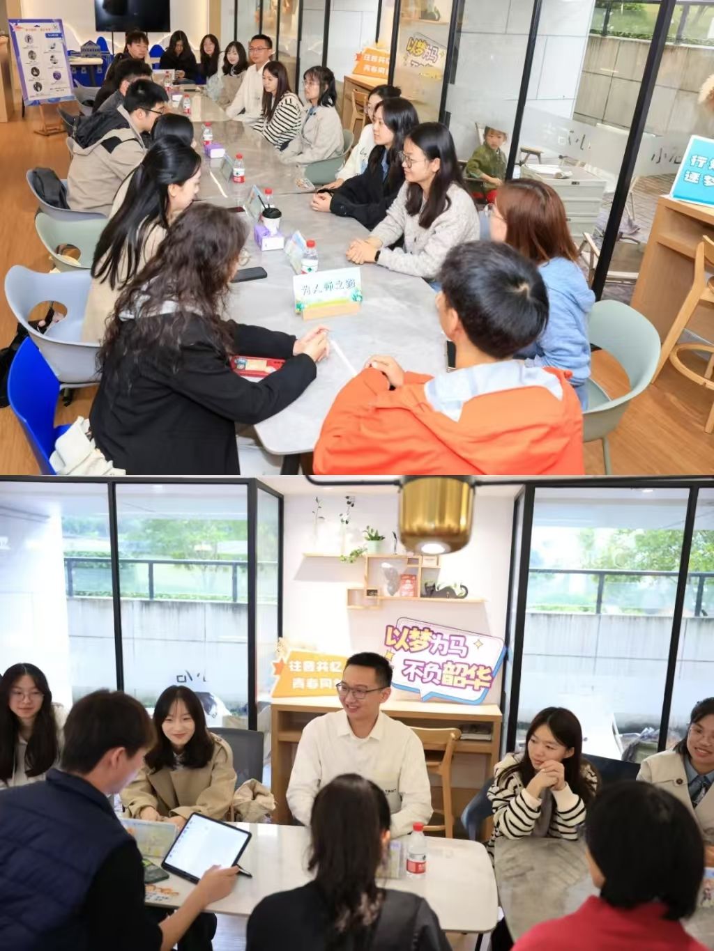 8位毕业校友与学弟学妹们在小时光面对面交流,分享了自己从学生到教育领域从业者的成长历程。他们就求职经验、职业发展路径、教育行业的挑战与机遇等方面做了深入的交流。学子们也积极提出自己的看法与困惑,校友们积极答疑解惑,现场气氛热烈。