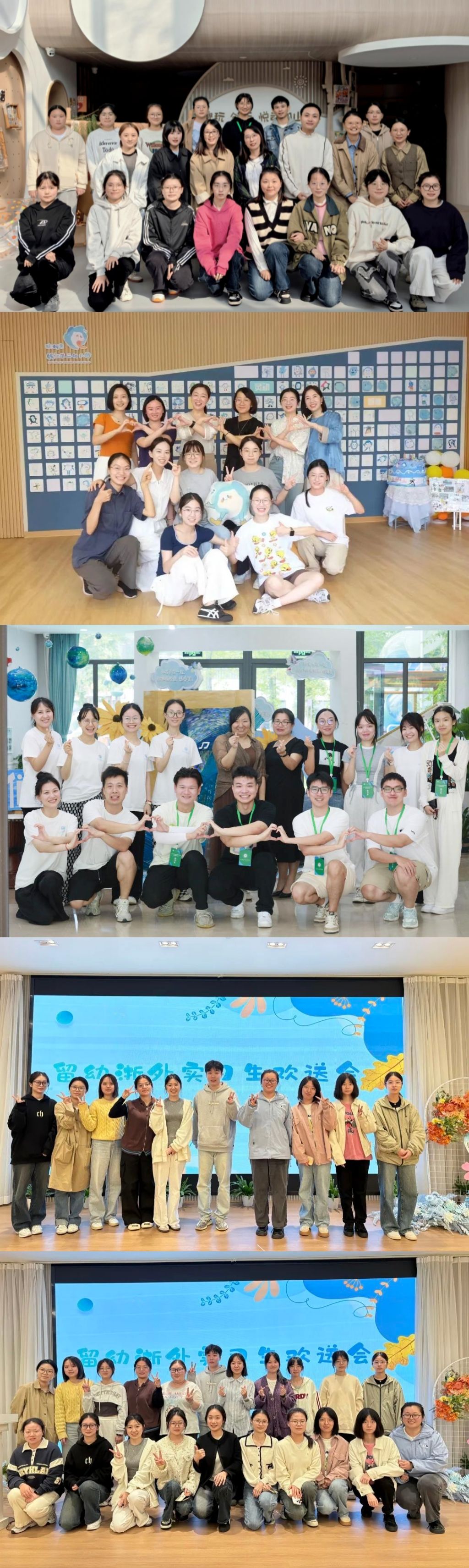 在实习期间,同学们深入幼儿园班级,积极参与日常教学和管理工作。从杭州市云溪幼儿园的创意环境布置到钱江第二幼儿园的多彩课程设计,再到留下幼儿园留和园区的观察记录与课程磨课,实习生们以热情和专业投入到教育实践中。通过与孩子们的互动,他们不仅提升了教学能力,也更加熟悉幼儿心理发展特点。实习的历程充满挑战与收获,同学们从陌生到熟悉,从紧张到自信,逐步成长为能够独当一面的幼教新人。
