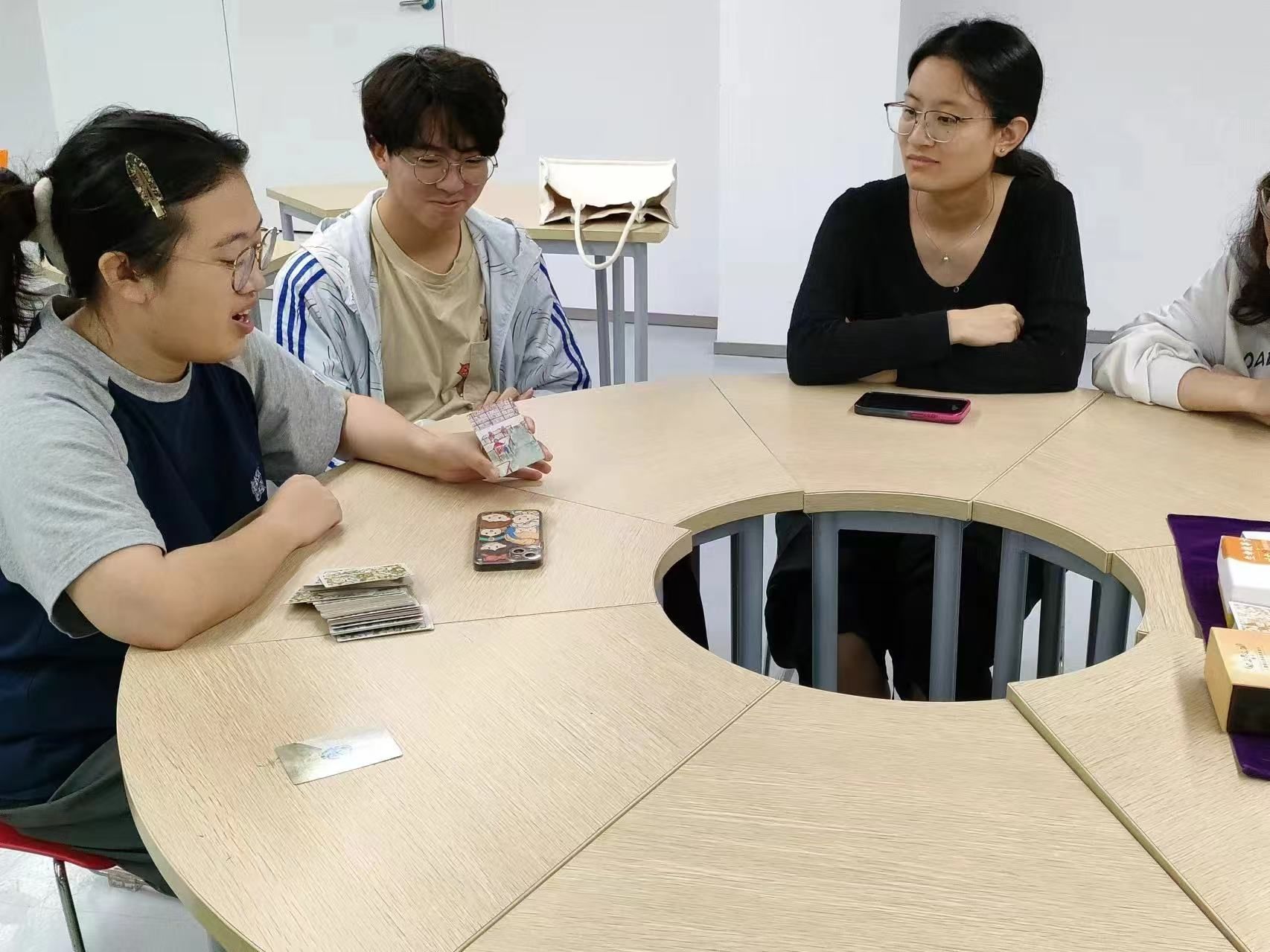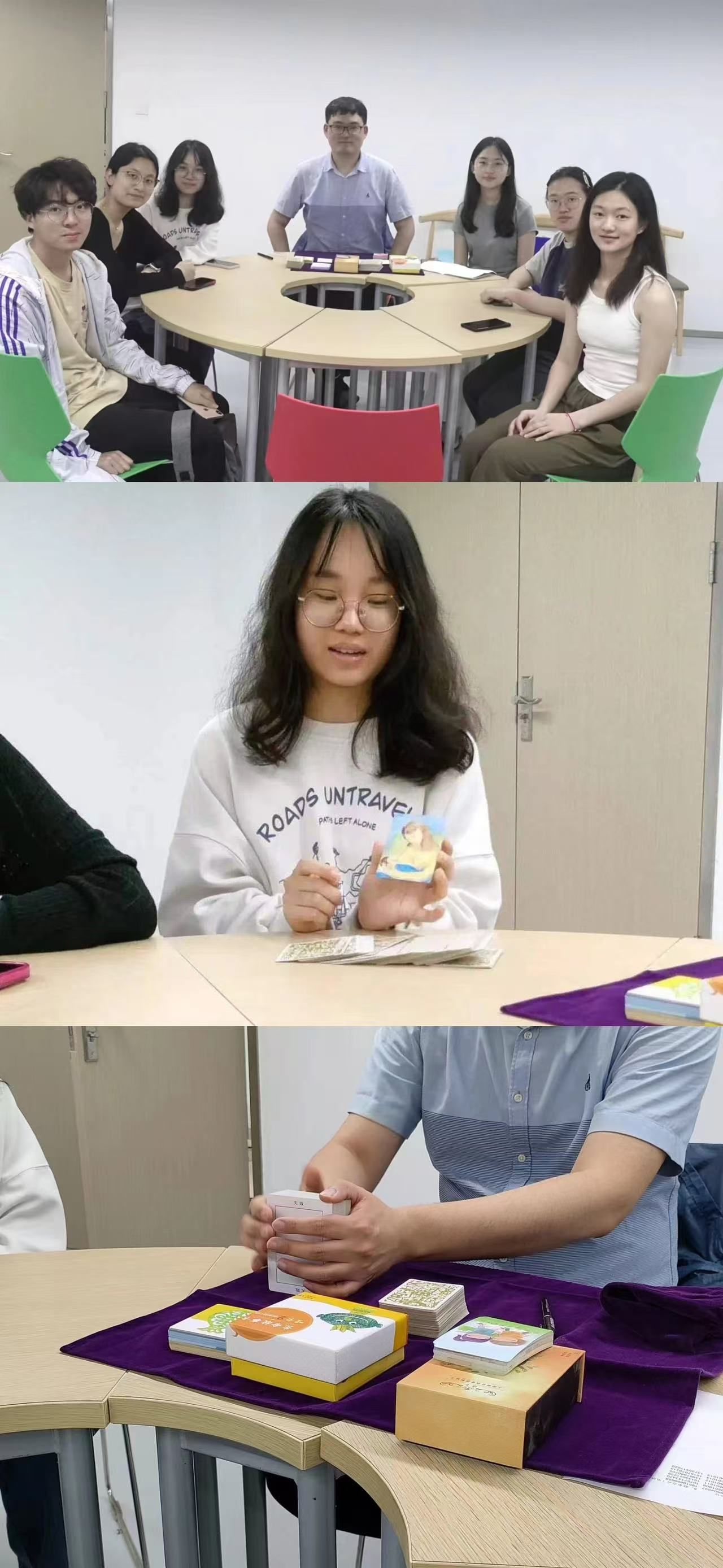 心协开展了“OH卡&叙事卡牌探索游戏”第二期团辅活动,该活动分为OH卡&叙事卡介绍,⾃我介绍环节,故事接⻰环节,叙事哇卡、悟卡访问练习这4个步骤。OH卡牌作为一种自我探索和心理治疗的工具,不仅帮助同学们在心灵之旅中挖掘和了解自己的潜意识想法,还通过分享和讨论个人对图像的联想,增强同学们与他人的交流和联系。