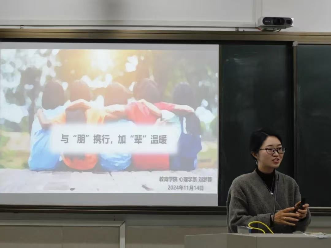 十一月中旬,心协举行了"与'朋'携行,加'辈'温暖"朋辈心理培训主题讲座,加强了学院心理骨干队伍建设,充分发挥了心理委员和寝室长的作用,增强其朋辈心理互助意识和能力。教院心理学系讲师、华东师范大学博士刘梦蓉老师应邀主讲。该讲座线上线下同步开展,全校近百名师生线上聆听,并通过线上视频回放使更多的师生受益。