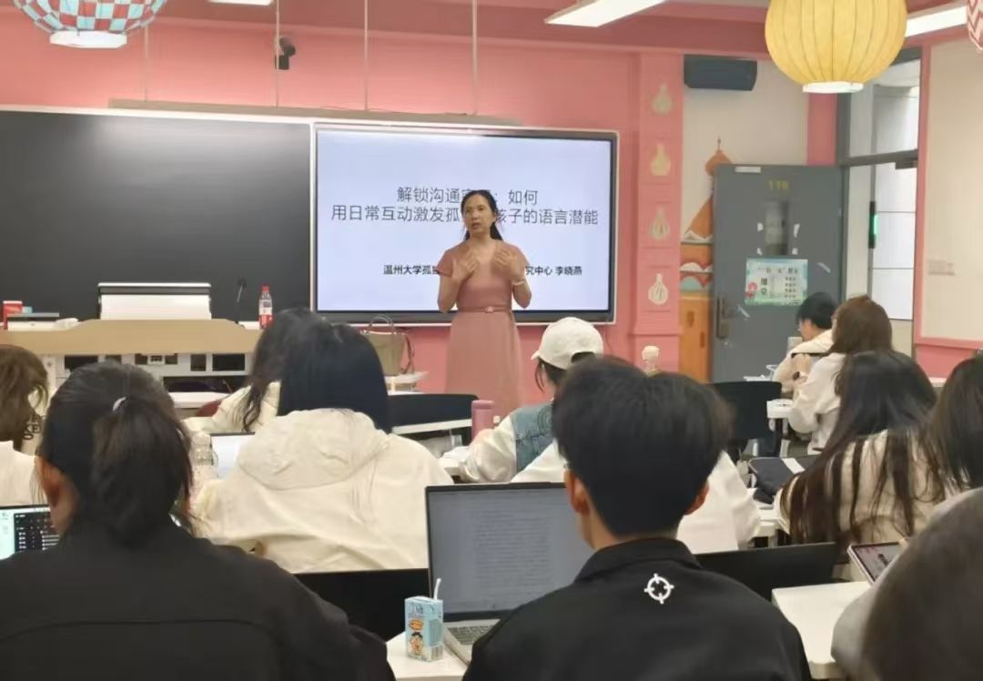 同时,温州大学学前教育系李晓燕教授应邀为同学们开展专题讲座,李晓燕教授20多年来致力于研究孤独症儿童教育,并带领团队在浙江、江苏、福建等地帮助400余个家庭提升与孤独症孩子的沟通能力。