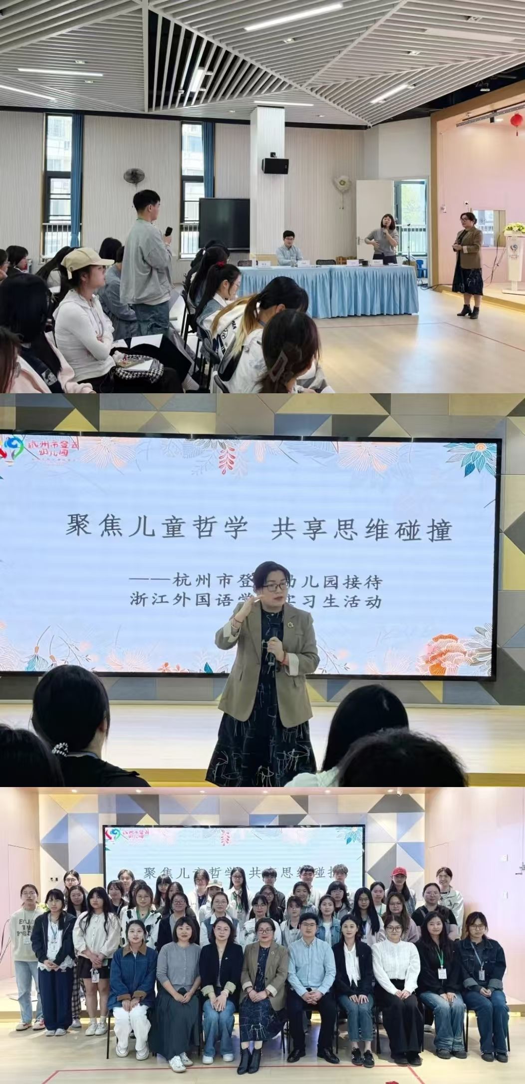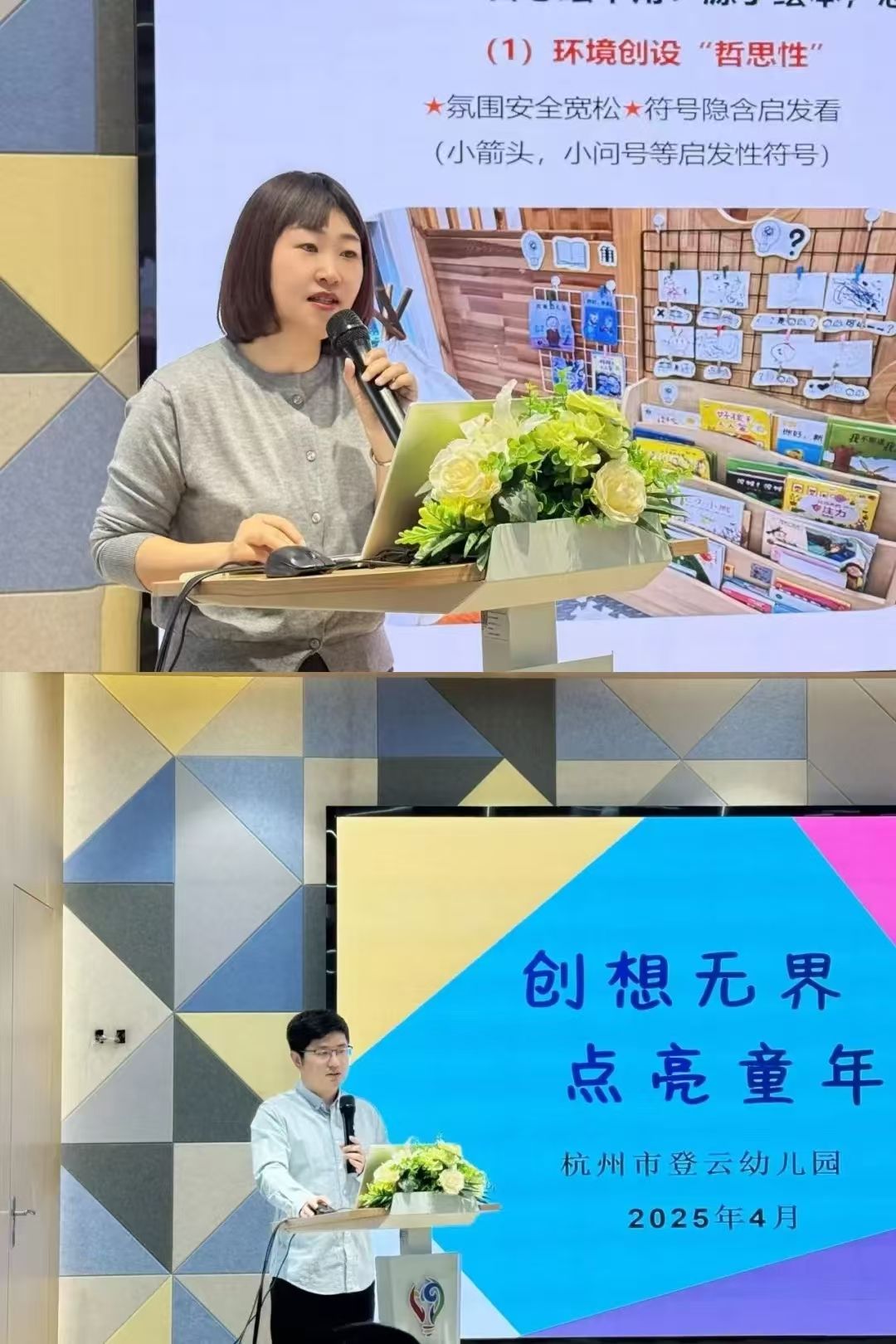 在学前教育系系主任冯翠典的带领下,同学们走进杭州市登云幼儿园,开启了一场以"儿童哲学"为核心的沉浸式研学。卢奔奎园长以《创想无界,点亮童年》为主题向同学们系统介绍了园所的办园理念,同时陈晓洁老师通过《寻辩式支架:推进幼儿园哲思主题实施的路径初探》专题分享,向同学们详细解析哲思主题课程的实施路径。