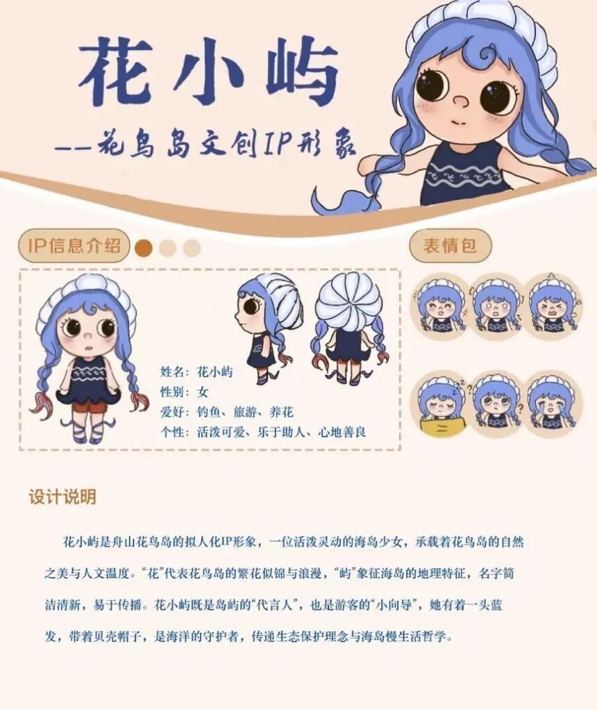 团队更以花鸟岛自然与人文元素为核心,设计出拟人化IP“花小屿”:蓝发象征“蓝眼泪”,贝壳帽呼应海洋生态,成为连接游客与海岛文化的纽带。