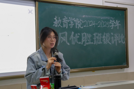 俞贝老师对本次活动进行了点评。她从现场表现,文本撰写、内容展示重点进行建议,并对在场的25级各班班委提出出了班级建设的建议与期望,希望各个班级向优秀榜样学习,知行合一,一起谱写教院荣光!