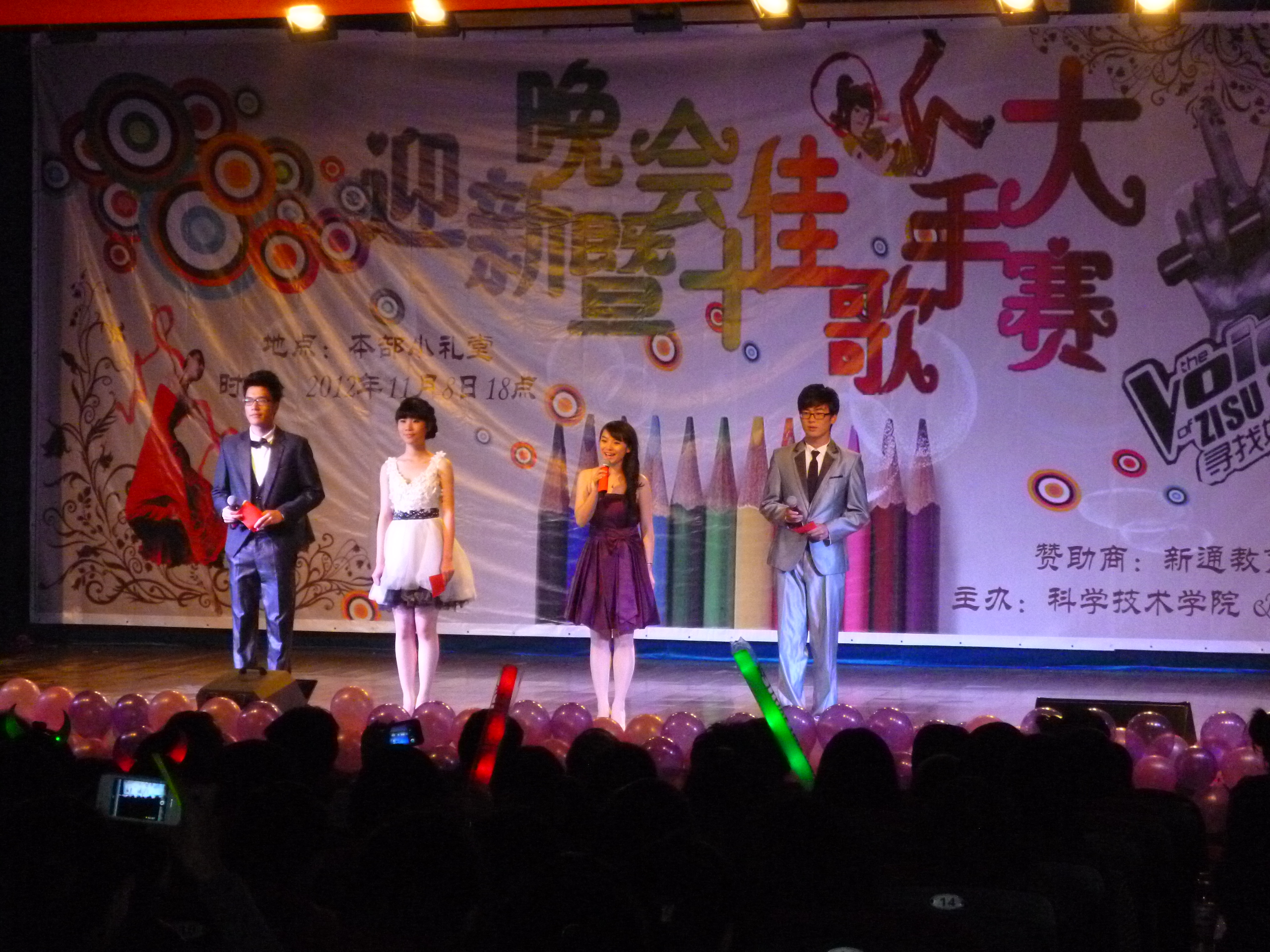 11月8日晚,教育科学学院和科学技术学院在小礼堂联合举办了2012迎新晚会暨十佳歌手大赛。两个学院的领导、班主任和学生代表400余人参加了晚会。
