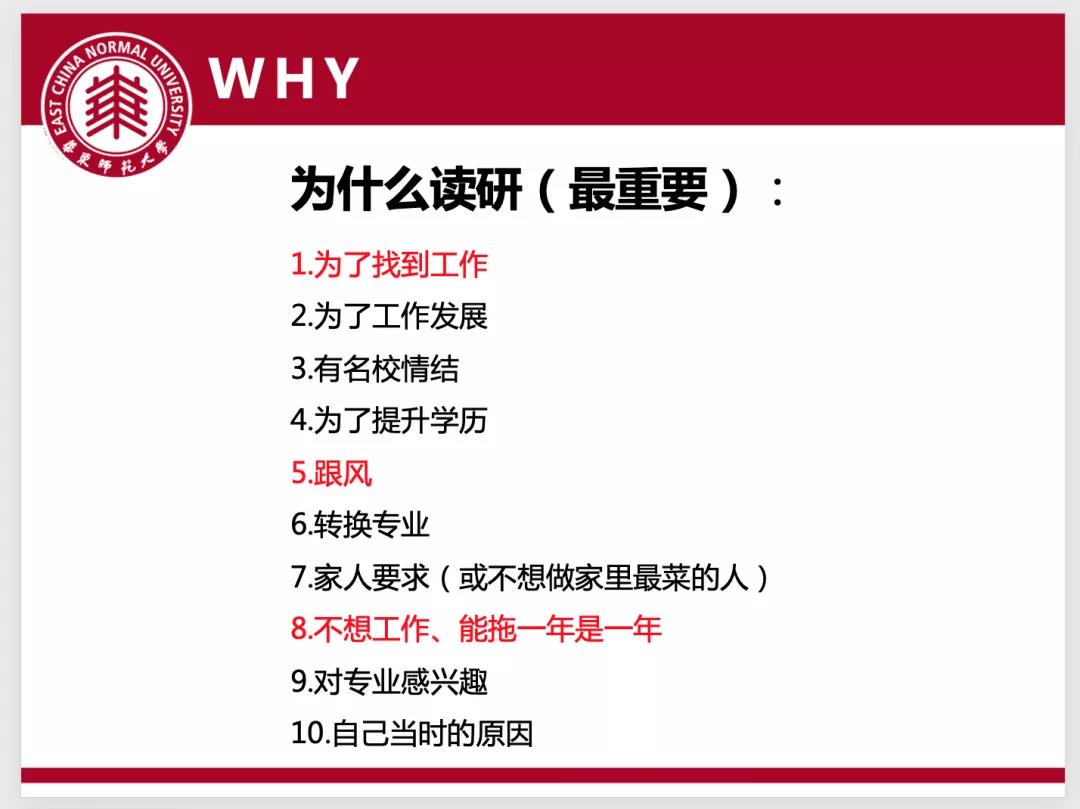 朱丹蕾从“who”“what”“why”和“how”四个方面进行了分享。首先她介绍了自己的学习简历。同学们惊叹于朱丹蕾学姐在毕业后不到三年时间内、在浙师大就读硕士期间取得的丰硕成果。接着,她以幽默风趣的口吻介绍了关于“研究生”“读研”“科研”“专硕”“学硕”等概念以及研究生导师的几种类型,帮助同学们选择更适合自己的方向。然后,朱丹蕾分析了为什么读研的各种答案,让大家明白不同的考研动机可能带来很不一样的体验。最后,朱丹蕾结合自身经历介绍了如何准备国内考研。