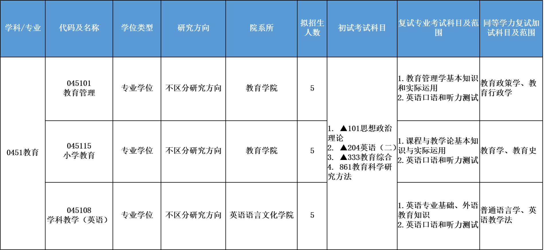 开设了教育管理学、基础教育教育测量与评价、教育研究方法、学科教学设计与实施研究等课程。